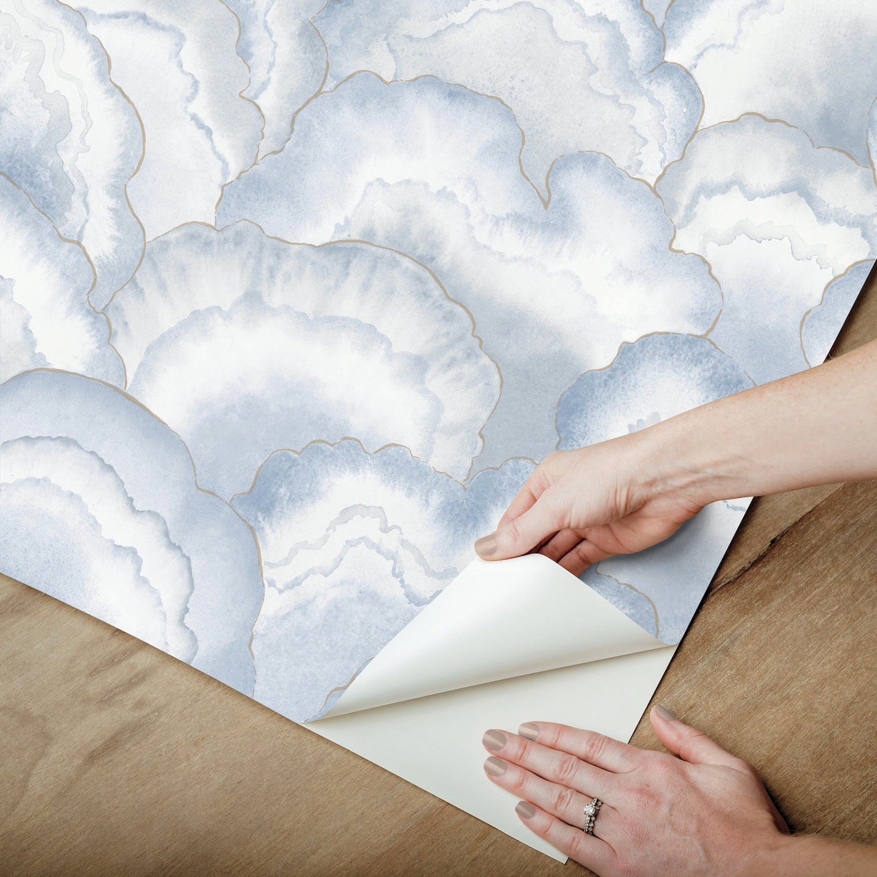 Use:Watercolor demilune shapes create layers of soft, natural semicircles on the pattern Abalone Fans. Seen here in sky blue, periwinkle, white, and metallic silver. This Abalone Fans Peel + Stick Wallpaper measures approximately 27 inches wide by 20 feet long, measuring approximately 45 square feet per roll. Candice Olson?s celebrated signature of current yet timeless design inspires these popular additions to her Premium Peel + Stick product offering. This is Simply Candice.