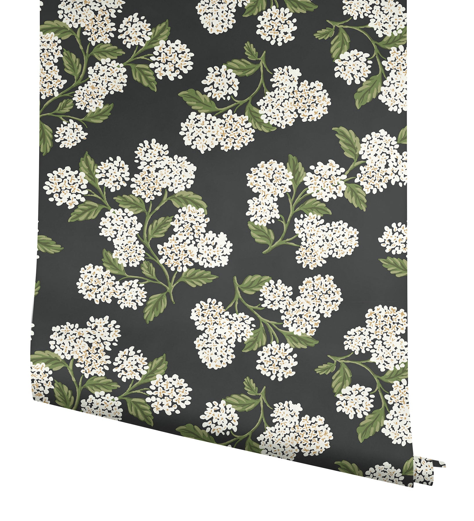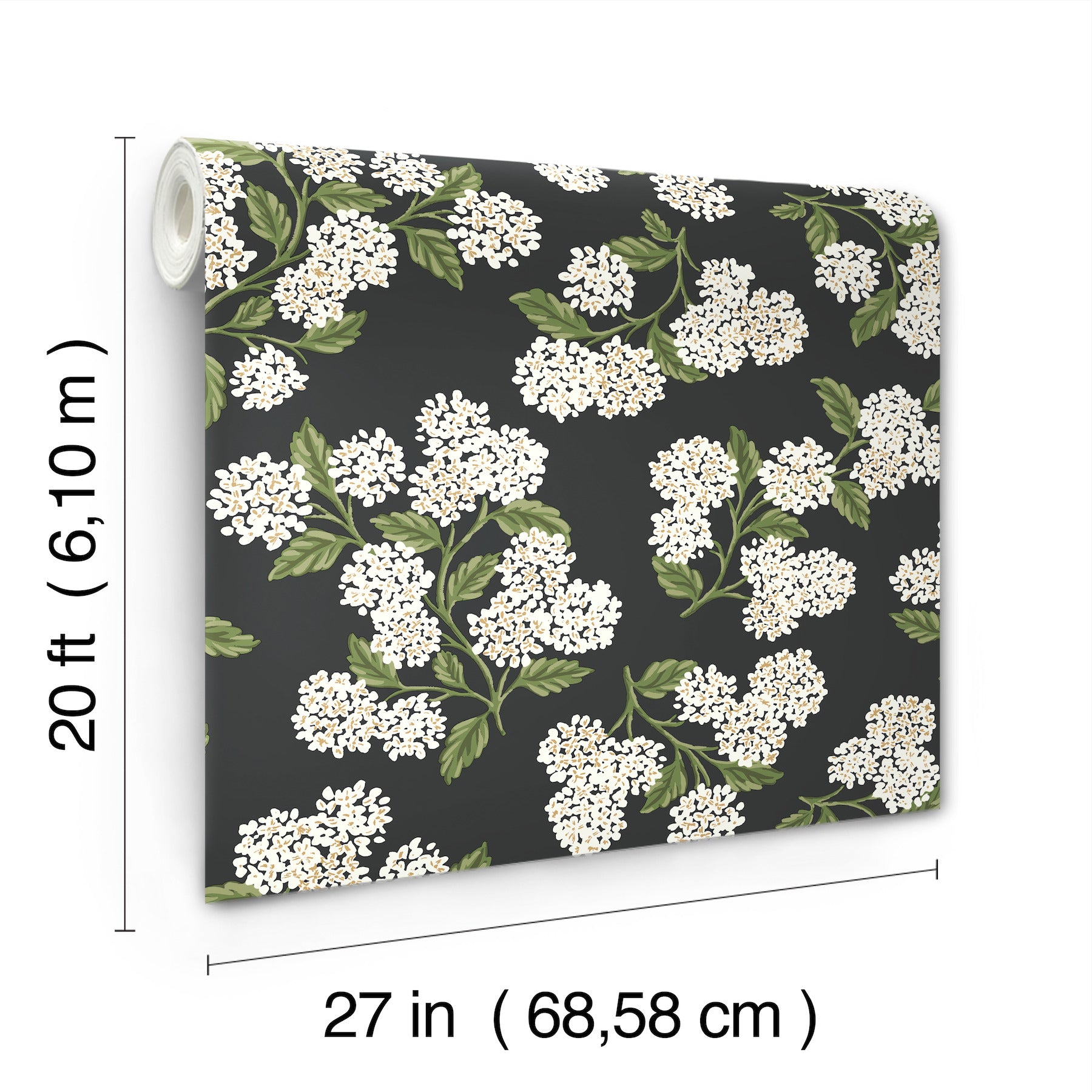 Use:The oversized Hydrangea print from Rifle Paper Co. is an elegant and elevated way to bring a bold floral to any space. Featuring white blooms with golden centers and green stems along a black backdrop. This Hydrangea Peel + Stick Wallpaper measures approximately 27 inches wide by 20 feet long, measuring approximately 45 square feet per roll. The Premium Peel + Stick collection from Rifle Paper Co. is a bright and beautiful way to make a statement at home. Featuring their signature florals, elegant linework, and charming illustrations, these wallcoverings are designed to bring unexpected beauty into the real world.