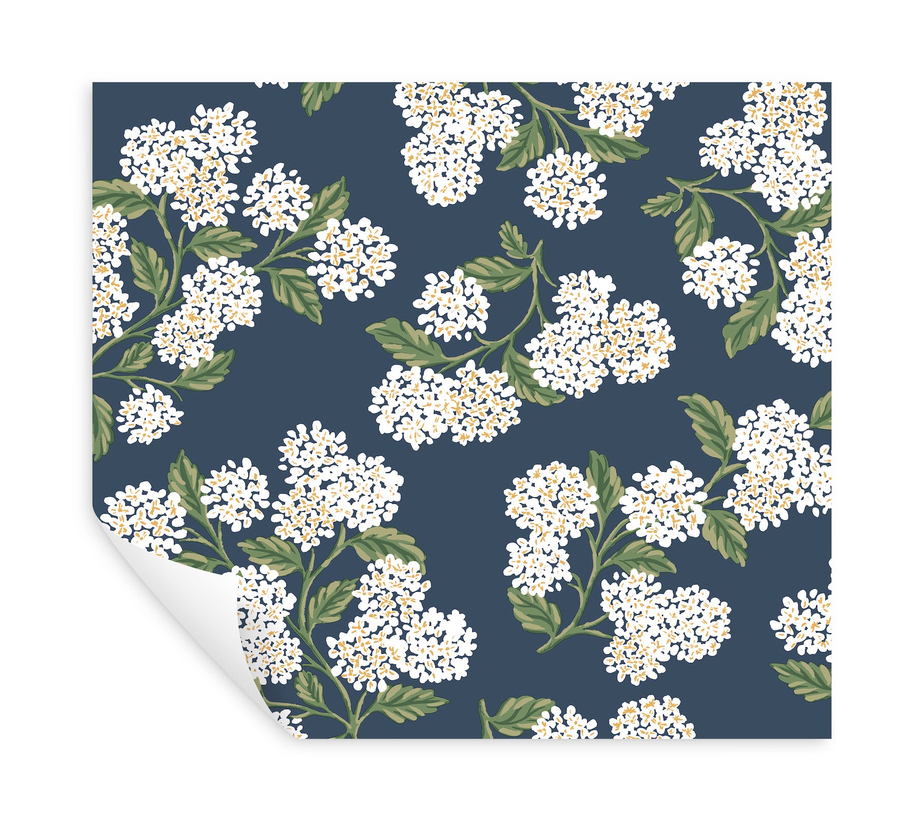 Use:The oversized Hydrangea print from Rifle Paper Co. is an elegant and elevated way to bring a bold floral to any space. Featuring white blooms with golden centers and green stems along a navy backdrop. This Hydrangea Peel + Stick Wallpaper measures approximately 27 inches wide by 20 feet long, measuring approximately 45 square feet per roll. The Premium Peel + Stick collection from Rifle Paper Co. is a bright and beautiful way to make a statement at home. Featuring their signature florals, elegant linework, and charming illustrations, these wallcoverings are designed to bring unexpected beauty into the real world.