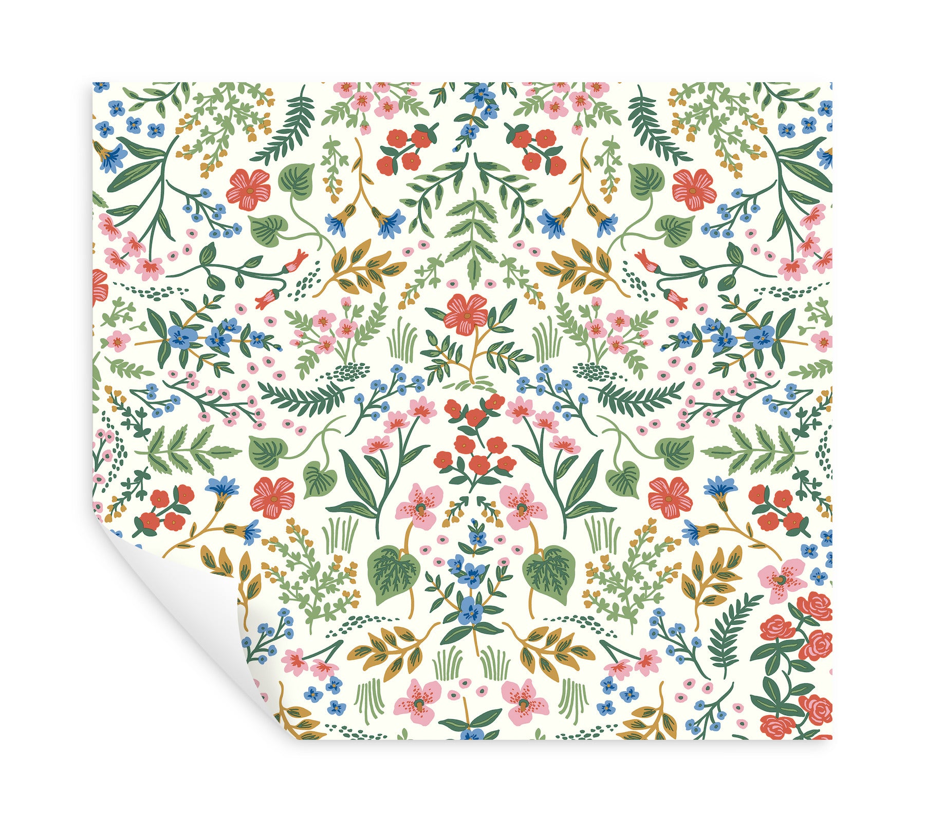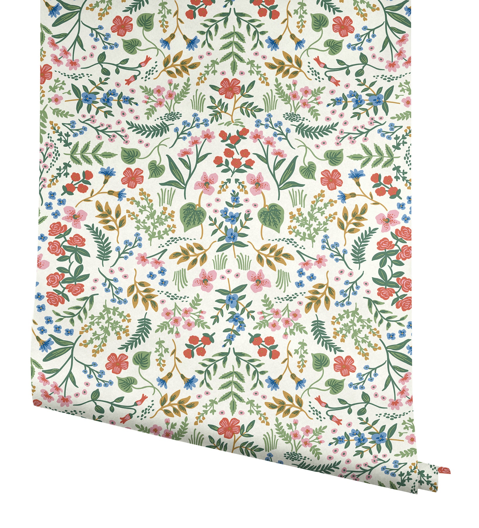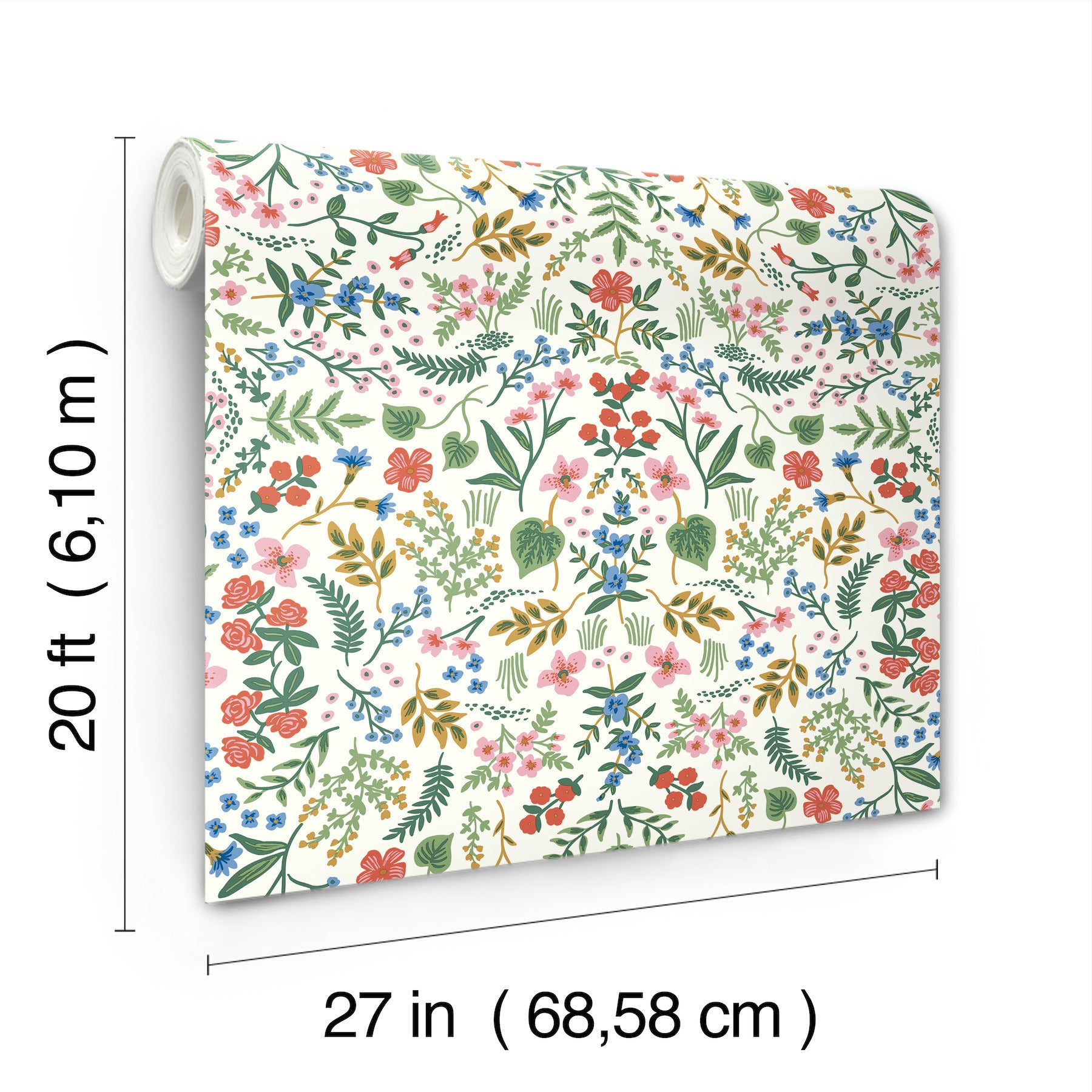 Use:This deliberately-placed pattern of wildflowers and greenery in Rifle Paper Co.?s Wildwood pattern creates a detailed, natural floral design inspired by antique botanical drawings. The flora is inked in shades of pink, red, green, light blue, and metallic gold against a white backdrop. This Wildwood Peel + Stick Wallpaper measures approximately 27 inches wide by 20 feet long, measuring approximately 45 square feet per roll. The Premium Peel + Stick collection from Rifle Paper Co. is a bright and beautiful way to make a statement at home. Featuring their signature florals, elegant linework, and charming illustrations, these wallcoverings are designed to bring unexpected beauty into the real world.