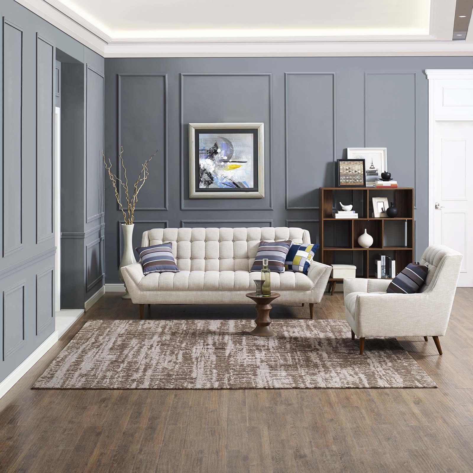 Use:Make a sophisticated statement with the Darja Distressed Rustic Modern Abstract Area Rug. Patterned with an elegant modern design, Darja is a soft machine-woven polyester microfiber rug that offers wide-ranging support and an exquisitely plush and cozy feeling underfoot. Complete with a jute fabric bottom, Darja enhances traditional and contemporary modern decors while outlasting everyday use. Featuring a stylish trellis design with a high density weave, this non-shedding area rug is the perfect addition to a living room, bedroom, entryway, kitchen, dining room, or family room. Darja is a family-friendly stain resistant rug with easy maintenance. Vacuum regularly and spot clean with diluted soap or detergent as needed. Create a comfortable play area for kids and pets while protecting your floors with this carefree decor update for your home.,Rustic Modern Abstract Area Rug