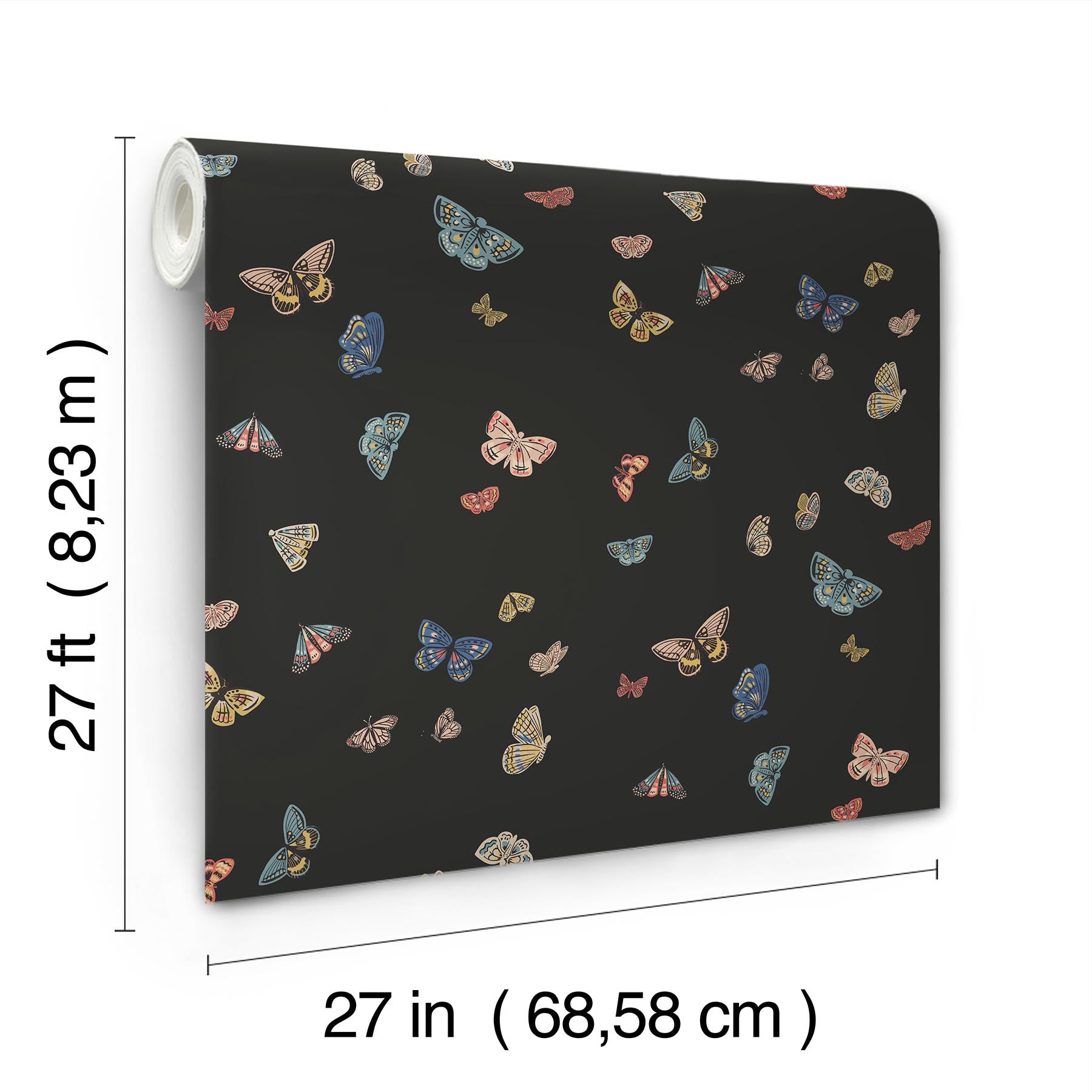 Use:Rifle Paper Co.?s Butterfly House wallpaper is a charming array of fluttering butterflies, with detailed wings and playful colors, including blues, yellows, pinks, and black. This Butterfly House Wallpaper measures approximately 27 inches wide by 27 feet long, measuring approximately 60.8 square feet per roll. The world of Rifle Paper Co. is in full bloom with their third wallpaper collection. With statement floral prints, detailed illustrated designs, and metallic accents, this collection is designed to bring beauty to every room.
