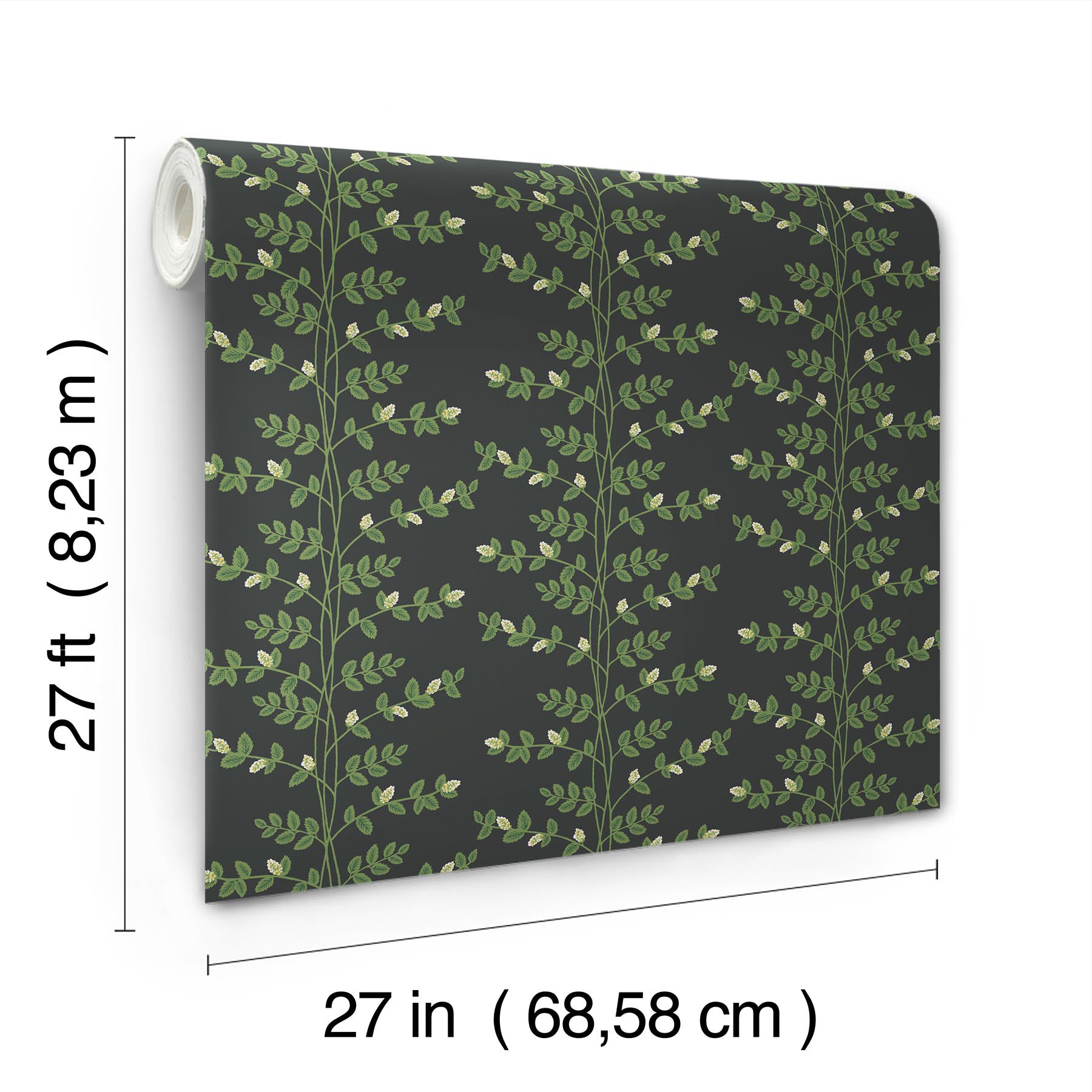 Use:Climbing Vine is a design of delicate leaves growing in a botanical take on a vertical stripe, dotted with little flowers. Illustrated in shades of green, white, and black. This Climbing Vine Wallpaper measures approximately 27 inches wide by 27 feet long, measuring approximately 60.8 square feet per roll. The world of Rifle Paper Co. is in full bloom with their third wallpaper collection. With statement floral prints, detailed illustrated designs, and metallic accents, this collection is designed to bring beauty to every room.