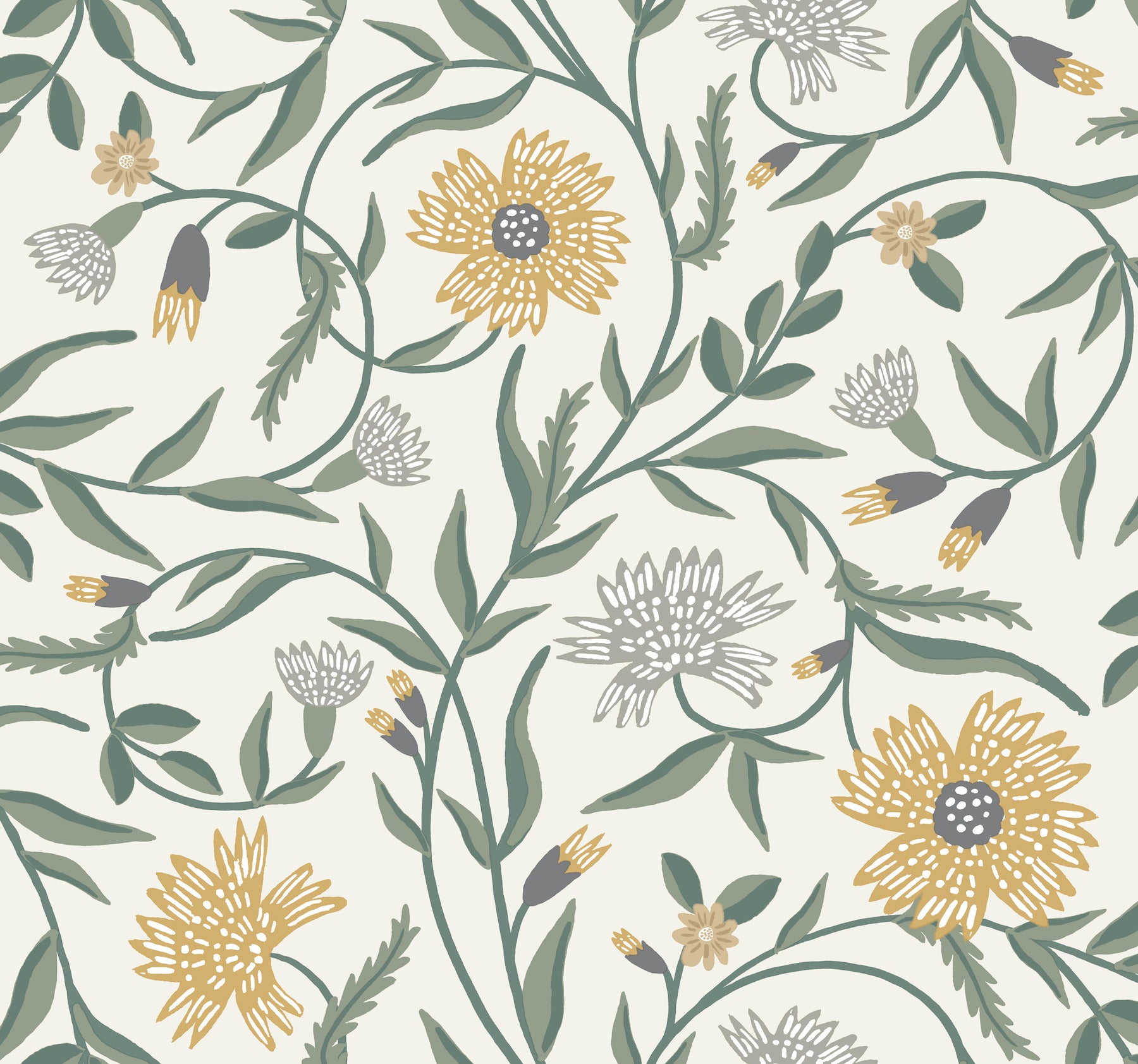 Use:Swirling stems and showy blooms pop on Rifle Paper Co.?s large-scale Aster wallpaper. Illustrated in shades of yellow, grey, and green. This Aster Wallpaper measures approximately 27 inches wide by 27 feet long, measuring approximately 60.8 square feet per roll. The world of Rifle Paper Co. is in full bloom with their third wallpaper collection. With statement floral prints, detailed illustrated designs, and metallic accents, this collection is designed to bring beauty to every room.