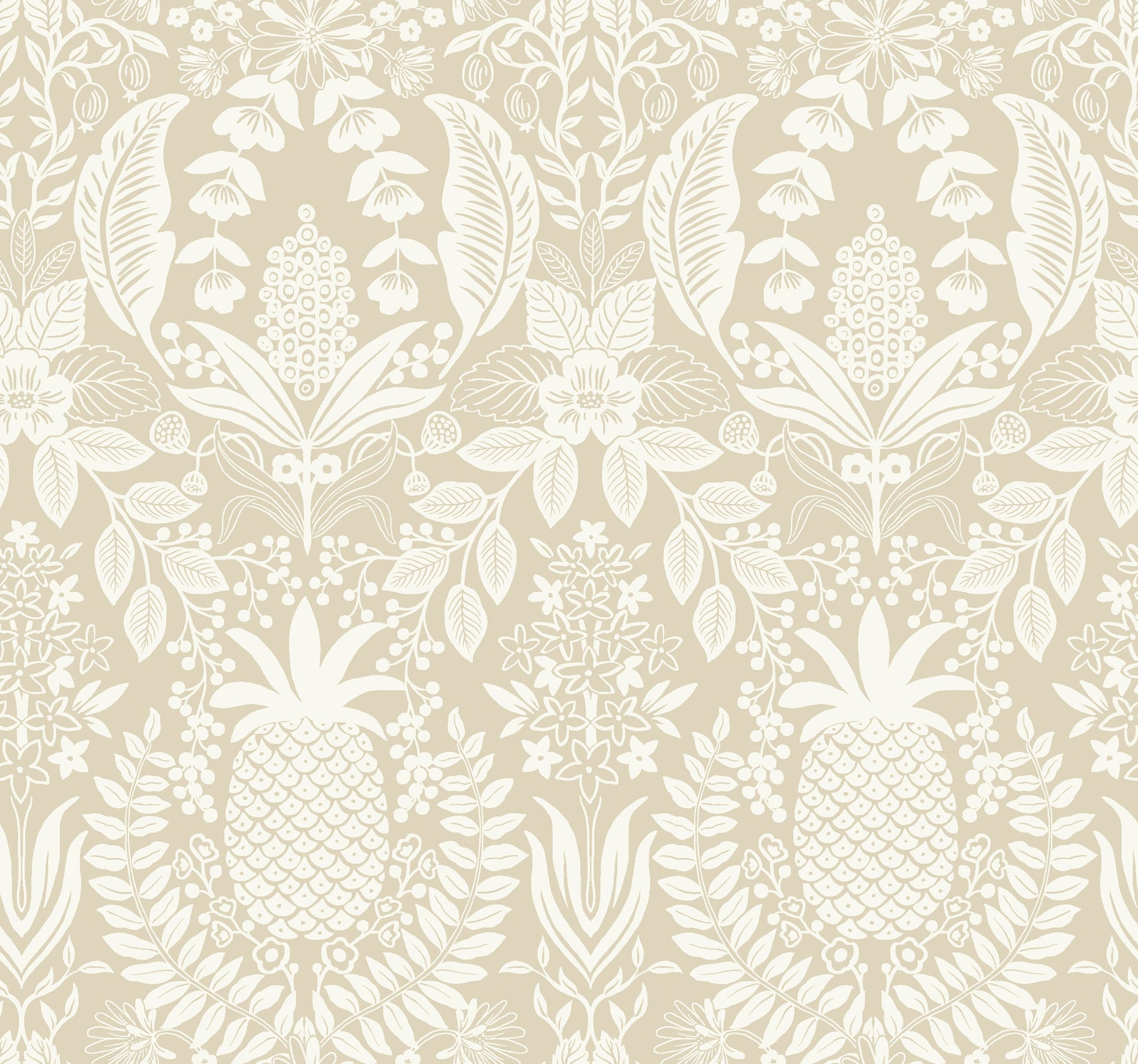 Use:Reminiscent of traditional textile wallcoverings, Rifle Paper Co.?s Pineapple Damask wallpaper features symmetrical trellises and pineapples, a traditional symbol of hospitality. Illustrated in white against warm taupe. This Pineapple Damask Wallpaper measures approximately 27 inches wide by 27 feet long, measuring approximately 60.8 square feet per roll. The world of Rifle Paper Co. is in full bloom with their third wallpaper collection. With statement floral prints, detailed illustrated designs, and metallic accents, this collection is designed to bring beauty to every room.
