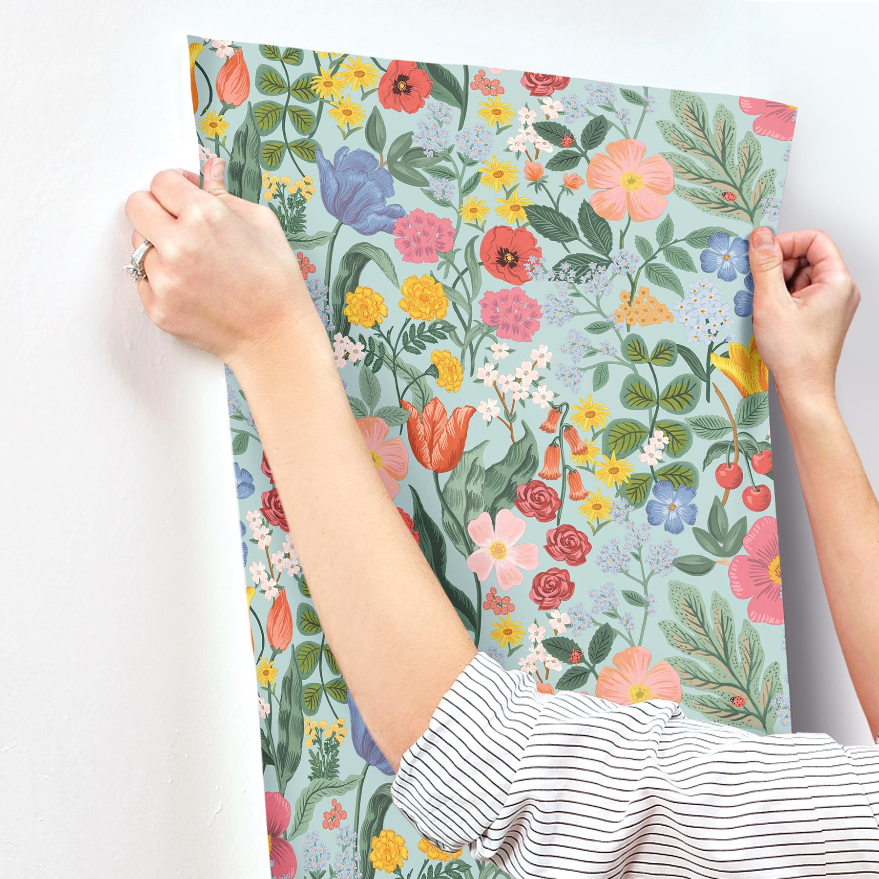 Use:Blossom is a rich garden full of bold blooms bursting with color. Tulips, sunflowers, cherries, moths and ladybugs are layered together to create a lush botanical print, illustrated in rainbow hues against sky blue. This Blossom Wallpaper measures approximately 27 inches wide by 27 feet long, measuring approximately 60.8 square feet per roll. The world of Rifle Paper Co. is in full bloom with their third wallpaper collection. With statement floral prints, detailed illustrated designs, and metallic accents, this collection is designed to bring beauty to every room.