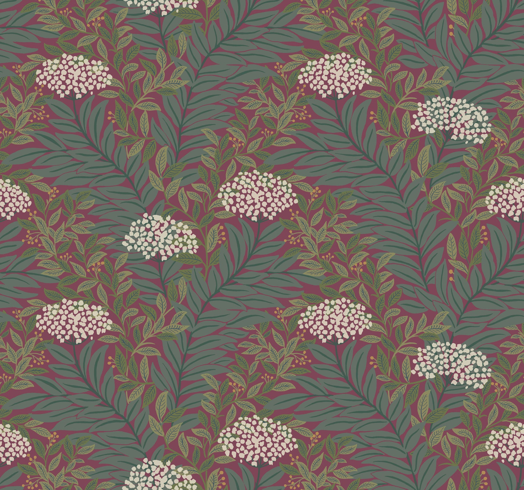 Use:Highgrove is a traditional design featuring layered leaves that create a lush tapestry of greenery, accented by sprays of Queen Anne?s Lace. Illustrated in shades of blue, green, white, and mulberry. This Highgrove Wallpaper measures approximately 27 inches wide by 27 feet long, measuring approximately 60.8 square feet per roll. The world of Rifle Paper Co. is in full bloom with their third wallpaper collection. With statement floral prints, detailed illustrated designs, and metallic accents, this collection is designed to bring beauty to every room.