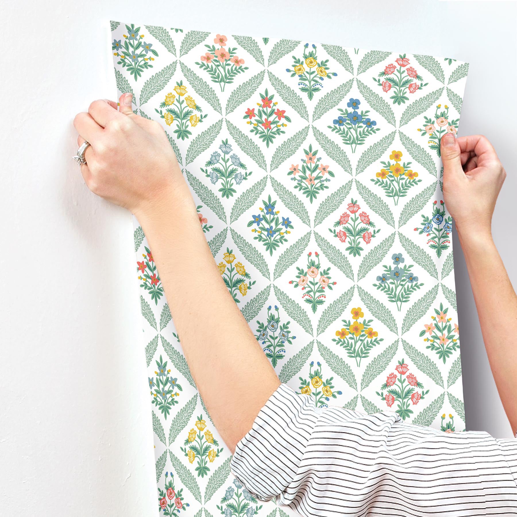 Use:Filigree leaves create a crosshatch grid filled with botanicals on Rifle Paper Co.?s Estee Garden wallpaper. Illustrated in shades of raspberry, peach, yellow, blue, and sage green. This Estee Garden Wallpaper measures approximately 27 inches wide by 27 feet long, measuring approximately 60.8 square feet per roll. The world of Rifle Paper Co. is in full bloom with their third wallpaper collection. With statement floral prints, detailed illustrated designs, and metallic accents, this collection is designed to bring beauty to every room.
