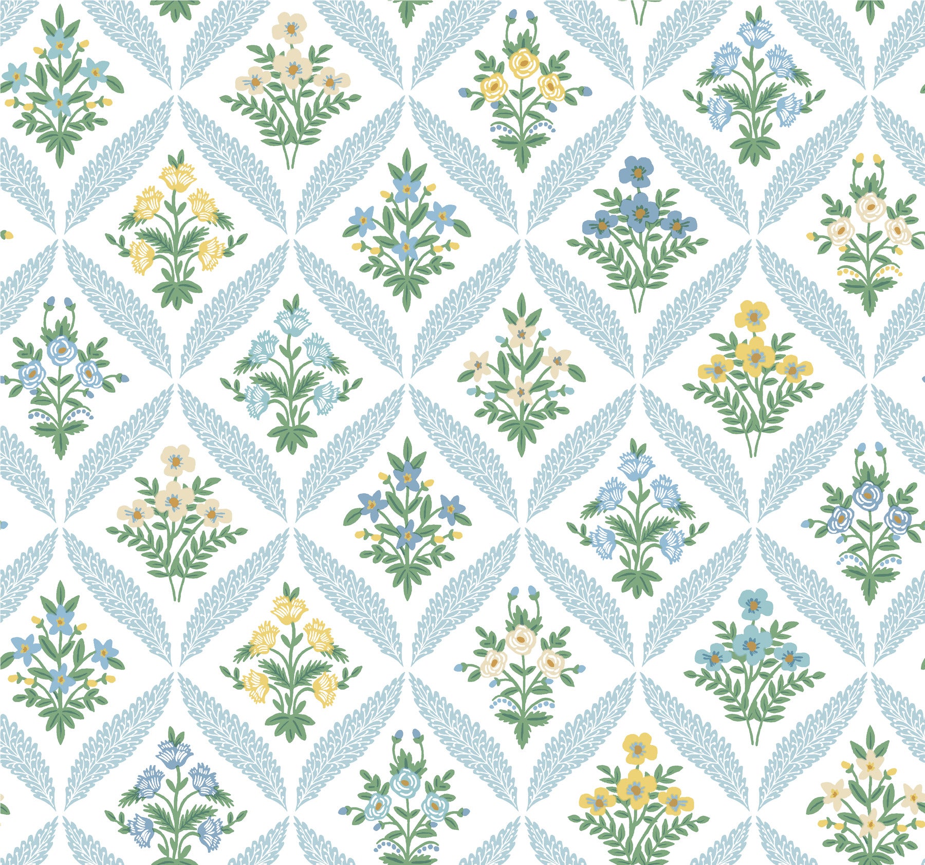 Use:Filigree leaves create a crosshatch grid filled with botanicals on Rifle Paper Co.?s Estee Garden wallpaper. Illustrated in shades of yellow, green, and blue. This Estee Garden Wallpaper measures approximately 27 inches wide by 27 feet long, measuring approximately 60.8 square feet per roll. The world of Rifle Paper Co. is in full bloom with their third wallpaper collection. With statement floral prints, detailed illustrated designs, and metallic accents, this collection is designed to bring beauty to every room.