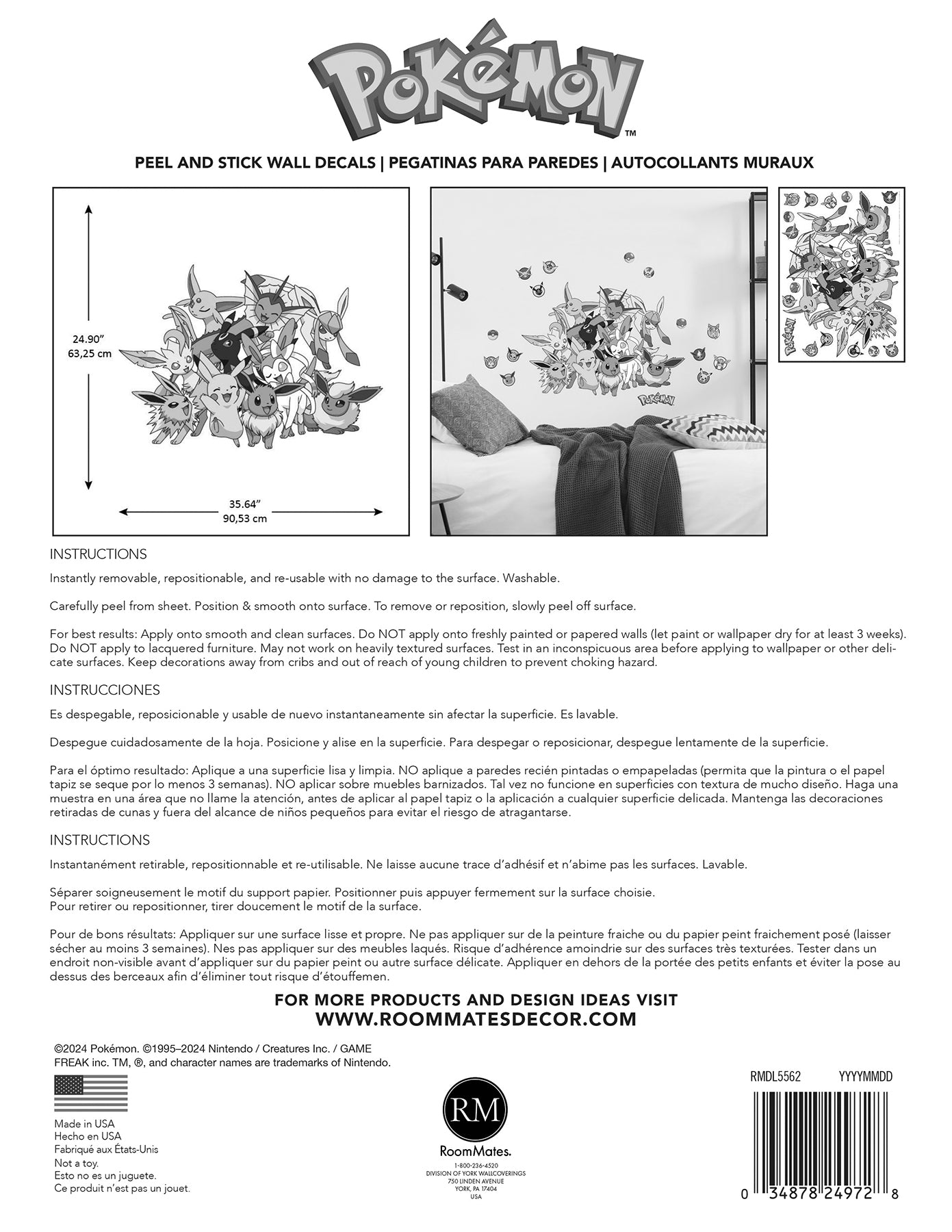 Size : Officially-licensed Pok??mon Eevee peel and stick wall decals featuring fan-favorite evolutions including: Jolteon, Vaporeon, Flareon, Espeon, Umbreon, Leafeon, Glaceon and Sylveon.Easy to apply - just peel and stick.Applies to any smooth, clean, flat surface; product may not adhere to unclean, textured, recently painted, or nonstick surfaces.Removable and repositionable with no sticky residue left behind.Contains (1) 36.5-in x 26.125-in sheets.Measures 36-in x 25-in when assembled.Printed on a safe, high quality material that is free of harmful chemicals like phthalates and lead.Smallest Decal: 2-in x 2-in, Largest Decal: 36-in x 25-in.Perfect for both renters and homeowners