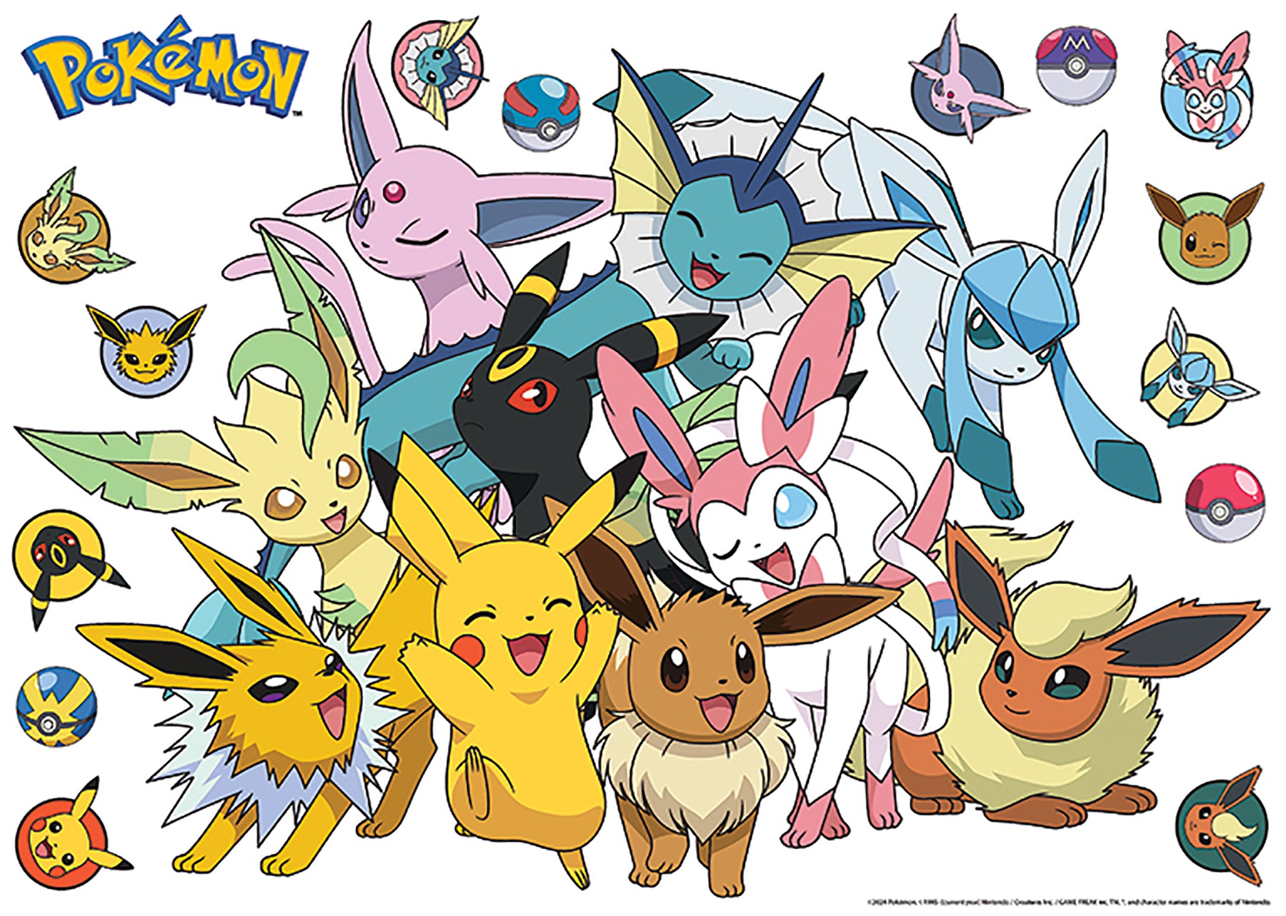 Use:Transform your space with this vibrant set of officially licensed Pok??mon wall decals featuring Eevee, Pikachu, and all of Eevee?s evolutions including Jolteon, Vaporeon, Flareon, Espeon, Umbreon, Leafeon, Glaceon and Sylveon. Perfect for fans of all ages, these peel and stick wall decals make it easy to add a playful, nostalgic touch to any room. Pokemon Evee Evolutions Multicolor Wall Decals contains 16 pieces on 1 sheet that measures 36.5-in x 26.125-in.