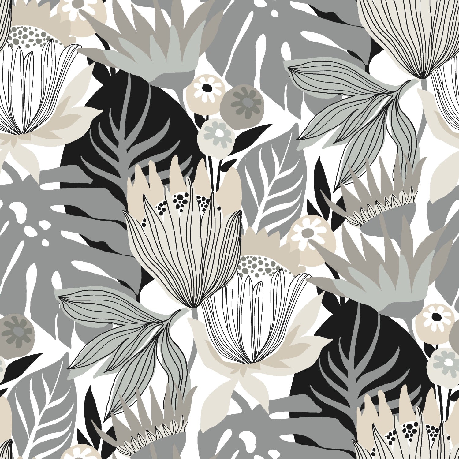 Pattern: RMK11488RL / Retro Tropical Leaves Grey Peel and Stick Wallpaper
