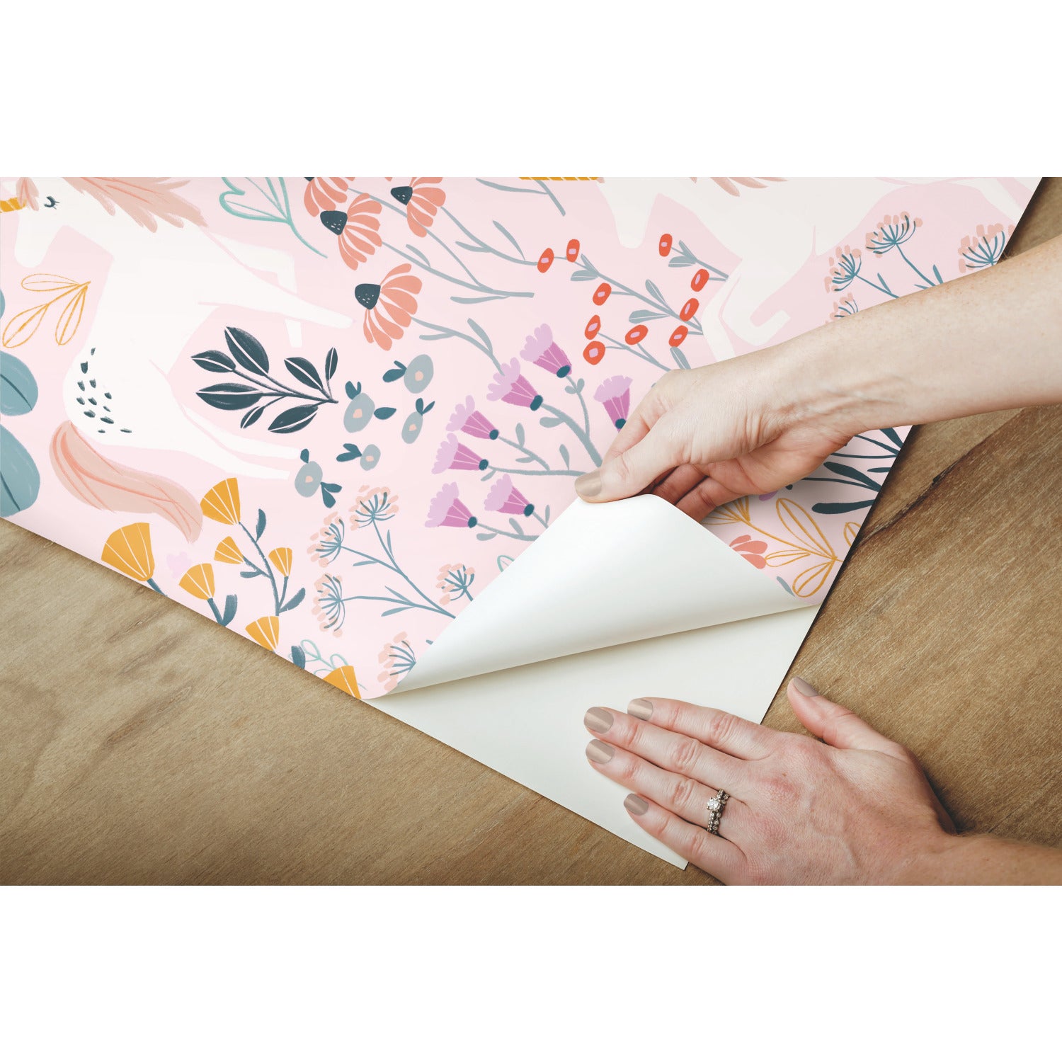 Use:Enchanted unicorns prance through wildflower fields in this magical Unicorn Paradise peel and stick wallpaper by Clara Jean Designs from RoomMates. Barely blush pink unicorns with golden horns frolic amidst pastel tones on pink cone flowers, lavender and golden bell flowers, Queen Anne?s lace and sprigs of eucalyptus leaves on a soft pale pink background. The design is whimsical and suitable for children?s playrooms, bedrooms or any room in the house where a little whimsey is desirable. RoomMates peel and stick wallpapers are an easy and affordable way to decorate. Peel off the paper backing and smooth onto the wall, no additional adhesive required. When it?s time to redecorate, simply remove them effortlessly in full strips with no remaining sticky residue or damage to walls. Meet Shauna and Afton, the mother and daughter duo behind Clara Jean Designs. Located in the Bay Area, they use a variety of mediums to create their designs, their favorites being watercolor and oil paint. They love to create art that is a reflection of the joy and beauty all around them. Named for Afton's daughter, the Clara Jean brand can be described as soulful, vibrant, and colorful.