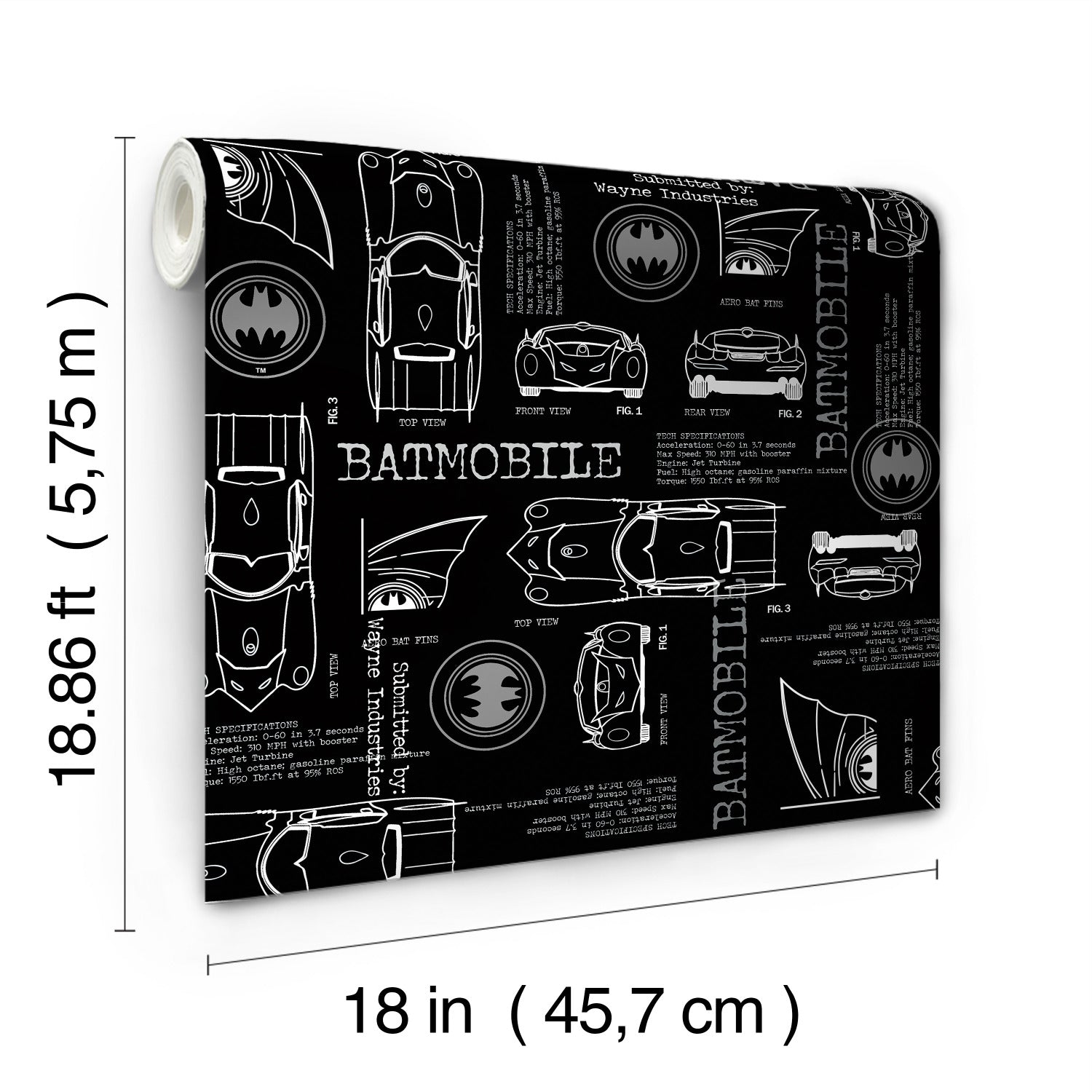 Use:This Batmobile Blueprint peel and stick wallpaper design from RoomMates is a cleverly creative decorative pattern for walls. A soft black background with white line drawings bring the heavily armored tactical vehicle out of the batcave and into your home. This is ?must-have d??cor? for any true Batman fan. RoomMates peel and stick wallpapers are an easy and affordable way to decorate. Peel off the paper backing and smooth onto the wall, no additional adhesive required. When it?s time to redecorate, simply remove them effortlessly in full strips with no remaining sticky residue or damage to walls.