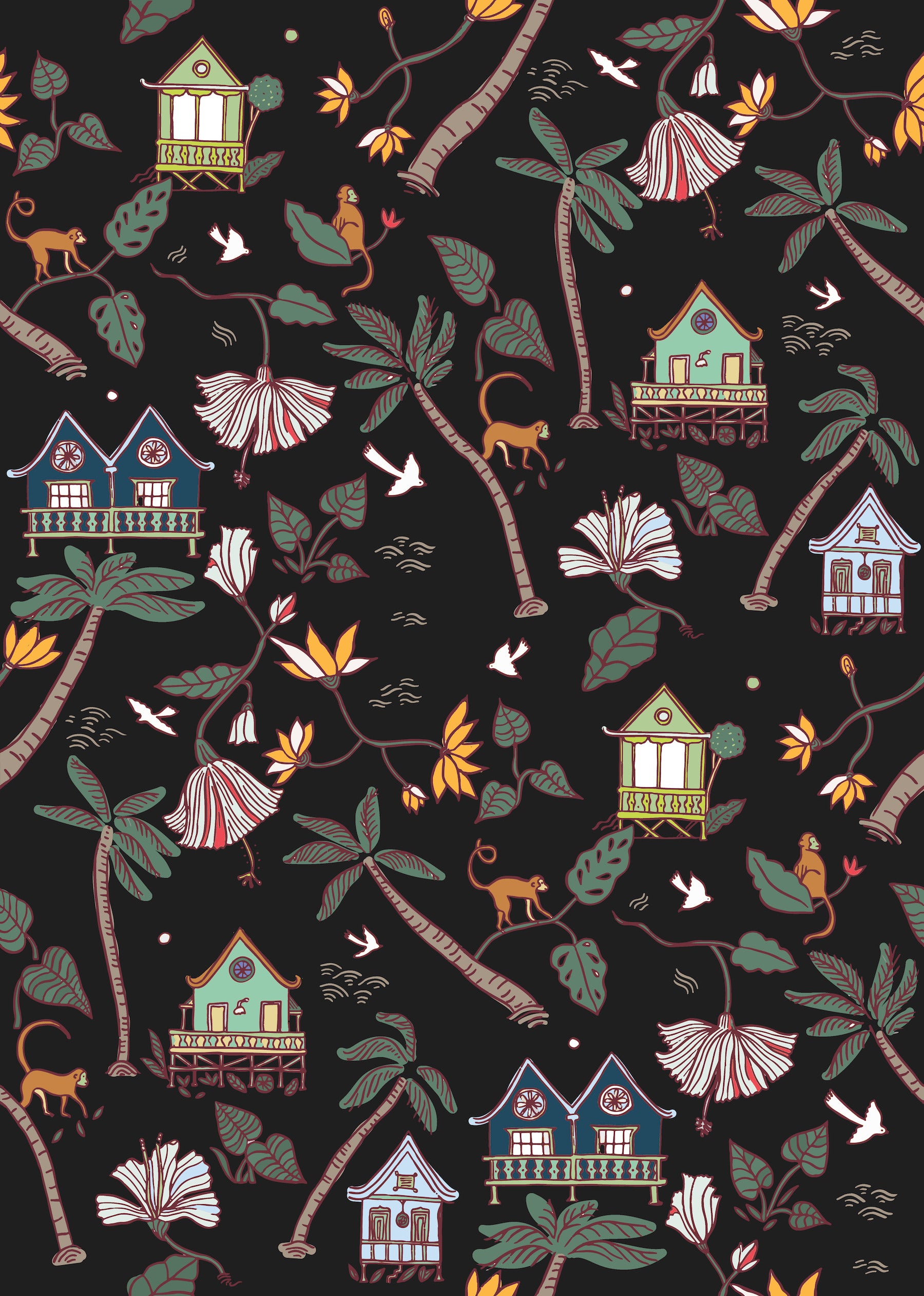 Use:Create a calming sanctuary with swaying palms, botanical florals, and tropical huts refreshed by a color palette of nature-inspired hues and an intense black matte in this Calypso Jungle Peel and Stick Wallpaper created by Priscilla Aguirre, the designer behind HolaLola.