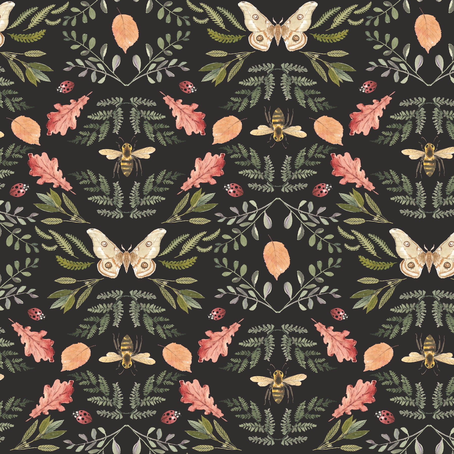 Pattern: RMK12471PLW / Penny Lane: Forest Cottage Bee and Butterfly Black Peel and Stick Wallpaper