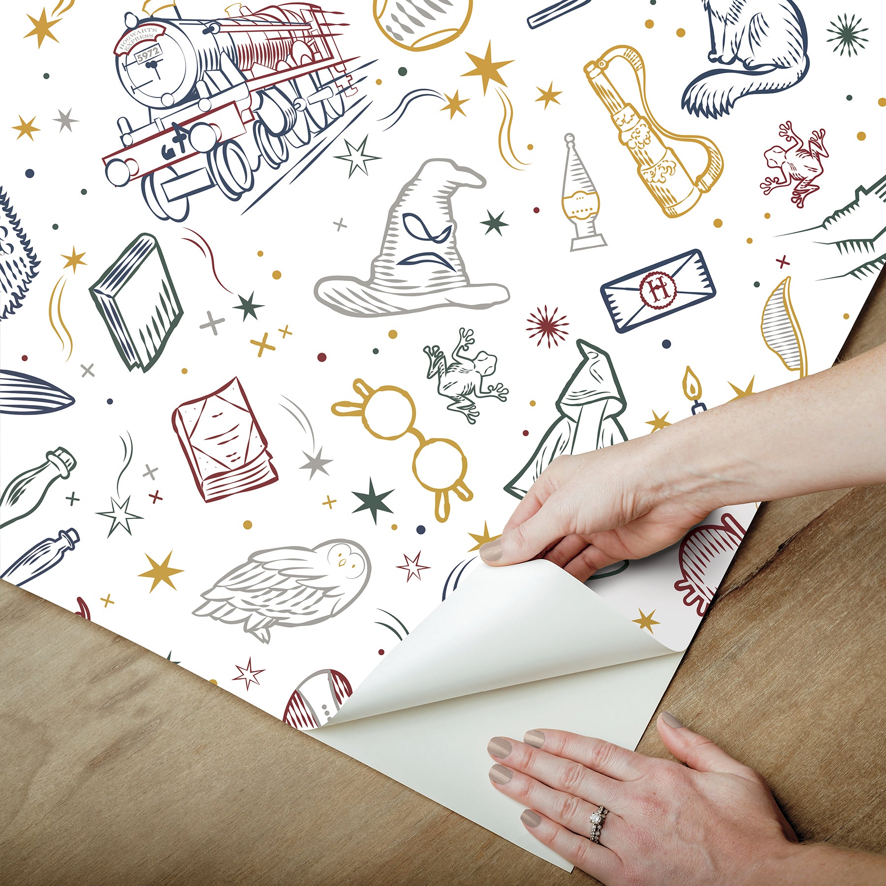 Size : Officially-licensed Harry Potter peel and stick wallpaper..Peel and stick to apply, pull up to remove.Harry Potter x RoomMates Peel and Stick Wallpaper is safe for walls and leaves no sticky residue behind.Easily repositionable while installing.Harry Potter x RoomMates Peel and Stick Wallpaper sticks to any smooth, flat surface - perfect for DIY projects.Ideal for rental or home decorating.Comes on an 18-in x 18.86-ft roll and covers about 28.3 sq. ft.Design repeat of 18-in.This product should NOT be applied to textured walls - smooth clean, dry, painted surface only (no Non-Stick paint or soap residue)
