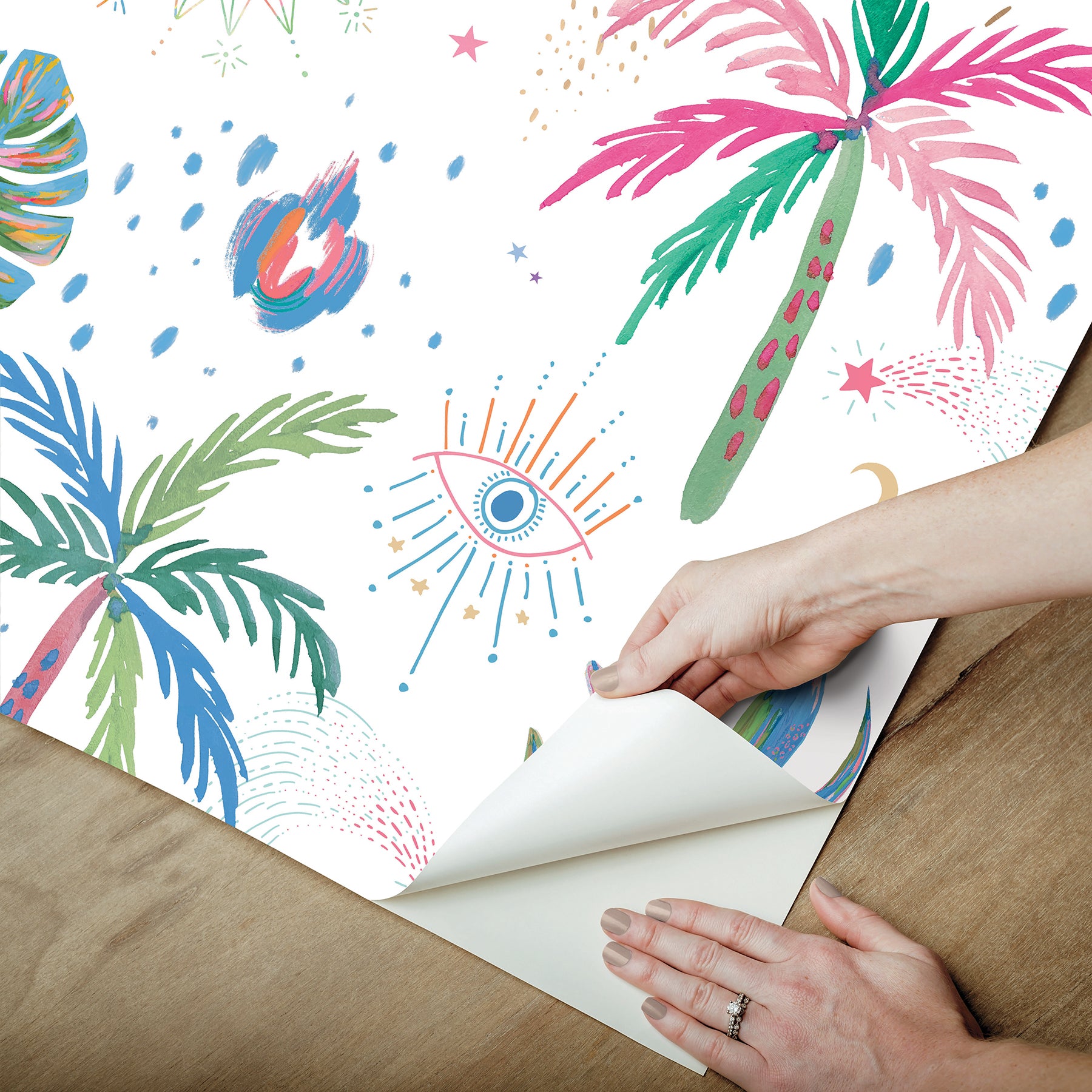 Size : Pink and blue tropical peel and stick wallpaper designed by EttaVee featuring palm trees and celestial bodies..Peel and stick to apply, pull up to remove.EttaVee x RoomMates Peel and Stick Wallpaper is safe for walls and leaves no sticky residue behind.Easily repositionable while installing.EttaVee x RoomMates Peel and Stick Wallpaper sticks to any smooth, flat surface - perfect for DIY projects.Ideal for rental or home decorating.Comes on a 20.5-in x 18-ft roll and covers about 30.8 sq. ft.Design repeat of 20.5-in.