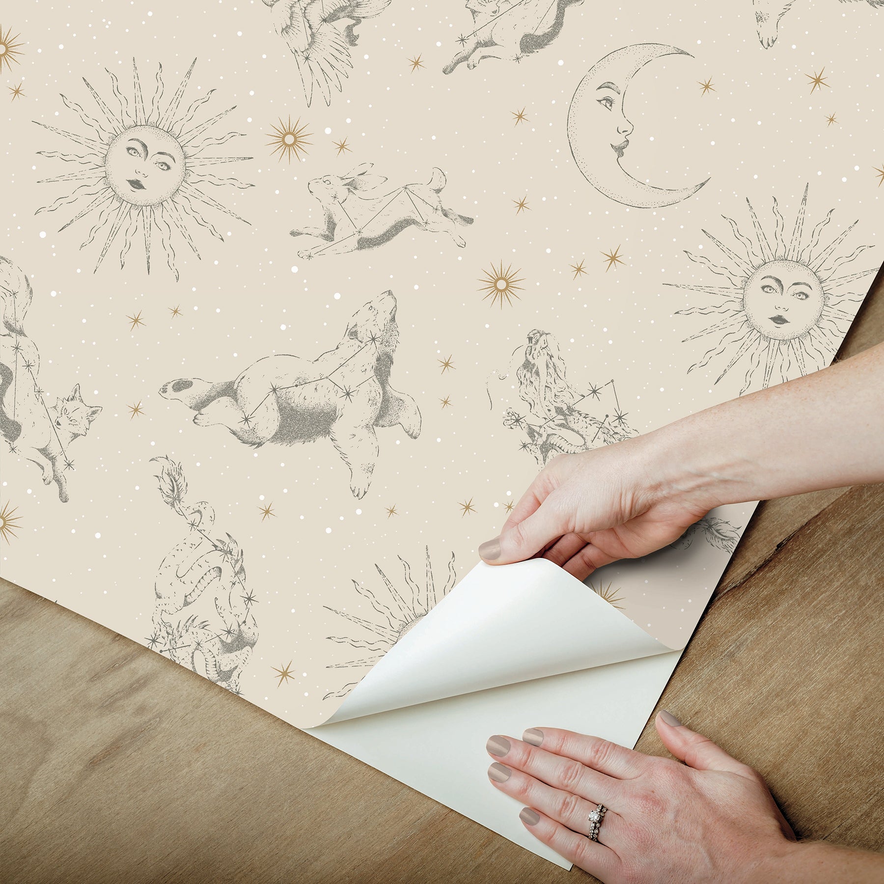 Use:Bring bookish charm to your space with this celestial peel and stick wallpaper by RoomMates. Astrological constellations and celestial bodies are arranged atop a light grey backdrop. Installation is as simple as Peel, Stick?Done!? Zodiac Dreams Linen Peel and Stick Wallpaper comes on one roll that measures 20.5 inches wide by 18 feet long.