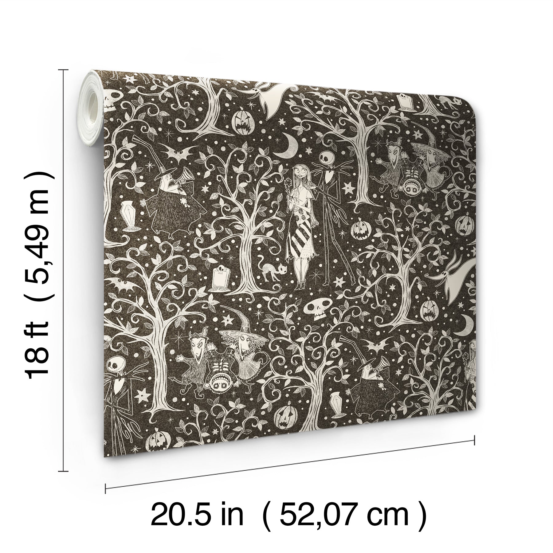 Use:This swirling forest toile print captures the haunting beauty of Disney Tim Burton?s The Nightmare Before Christmas. Disney?s Jack Skellington and Sally, Zero the dog, the Mayor, and other beloved characters meander through a forest of dormant trees and jack-o-lanterns in this romantic peel and stick wallpaper print by RoomMates. Installation is as simple as Peel, Stick?Done!? Disney Tim Burton's The Nightmare Before Christmas Sepia Forest Peel and Stick Wallpaper comes on one roll that measures 20.5 inches wide by 18 feet long.