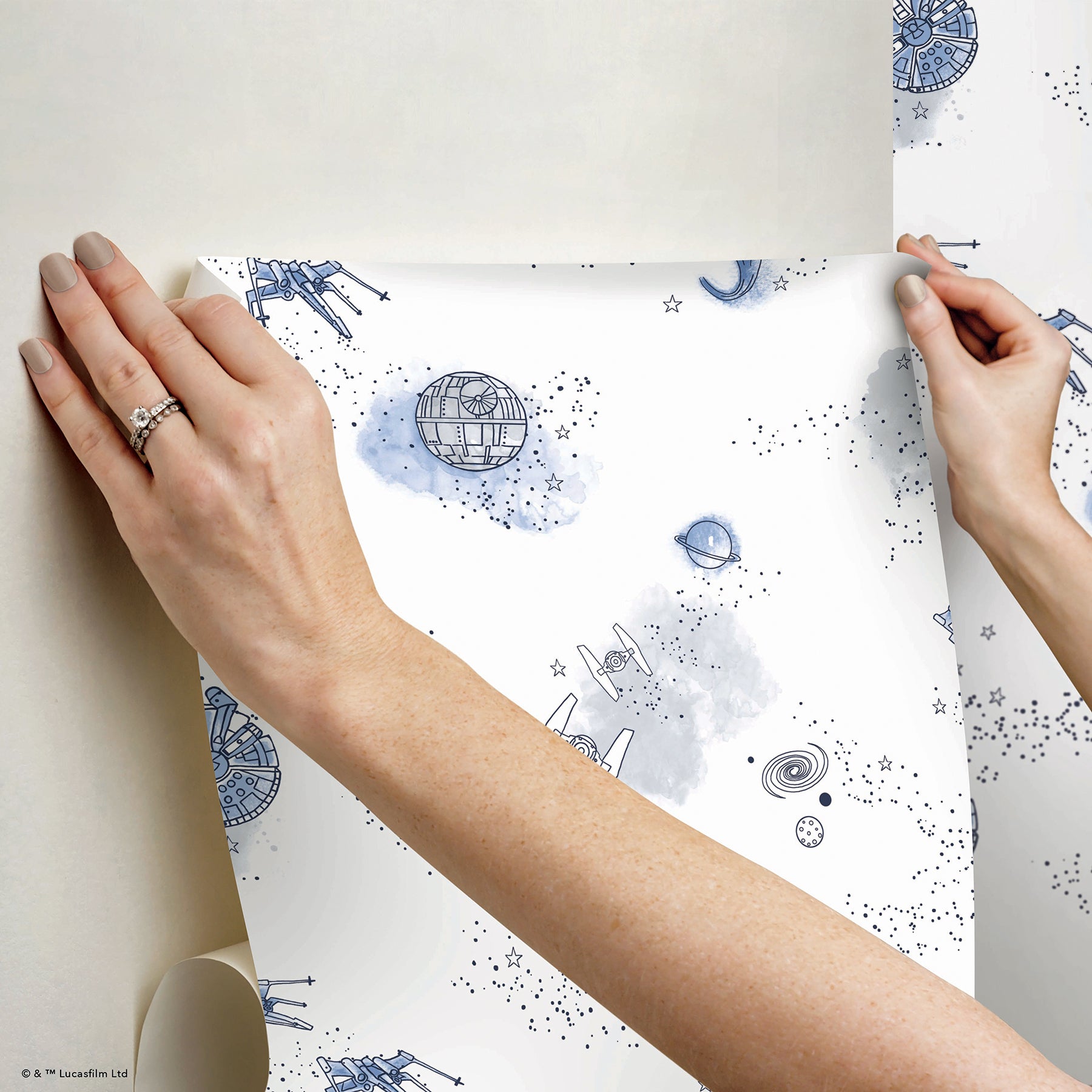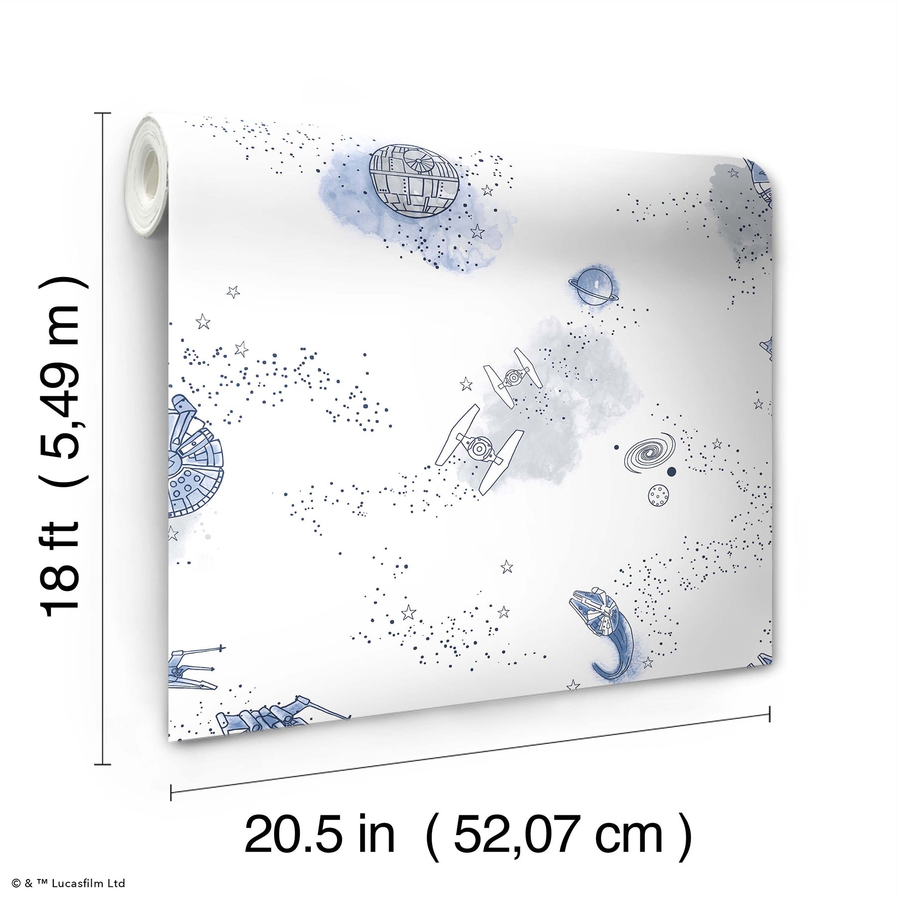 Use:Bring a galaxy of STAR WARS? inspired style to your room in just Peel, Stick?Done!? This celestial, toile-like print features a blue star-speckled arrangement of STAR WARS starships, planets and more over a white backdrop ? darling in nurseries, bedrooms, and beyond. STAR WARS Good Night Galaxy Peel and Stick Wallpaper comes on one roll that measures 20.5 inches wide by 18 feet long.