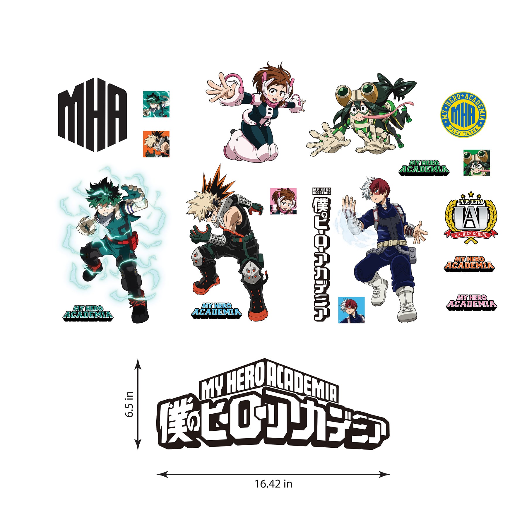Size : Officially licensed My Hero Academia peel and stick wall decals with imagery of Izuku Midoriya, Katsuki Bakugo, Ochaco Uraraka, Shoto Todoroki, and Tsuyu Asui.Easy to apply - just peel and stick.Applies to any smooth, clean, flat surface; product may not adhere to unclean, textured, recently painted, or nonstick surfaces.Removable and repositionable with no sticky residue left behind.Contains (4) 9-in x 17.975-in sheets.Measures 16.39-in x 6.45-in when assembled.Printed on a safe, high quality material that is free of harmful chemicals like phthalates and lead.Smallest Decal: 3.60-in x 1.15-in, Largest Decal: 6.45-in x 16.39-in.Perfect for both renters and homeowners