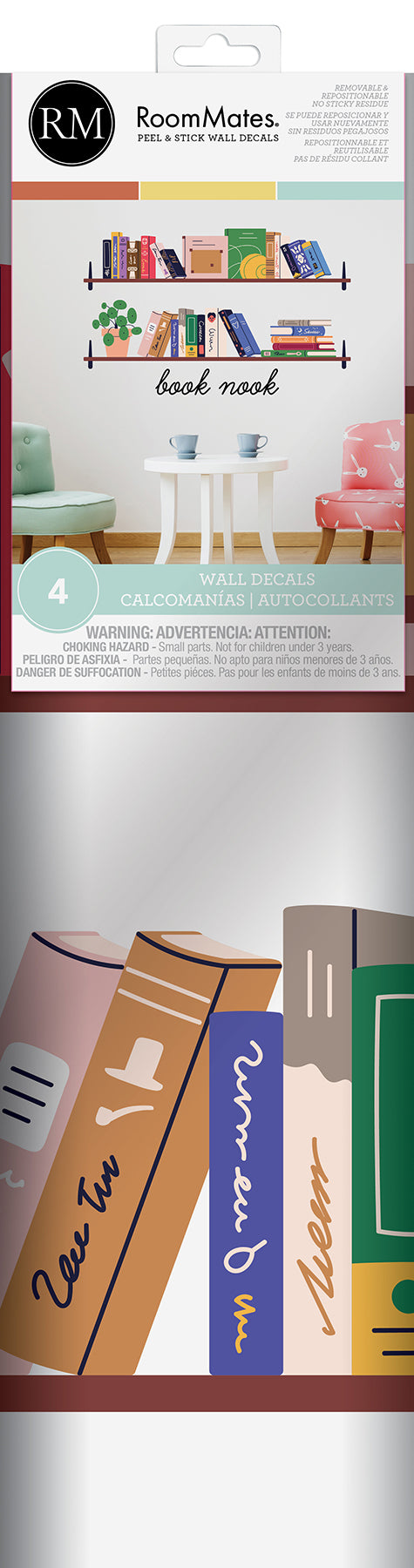 Use:Create a custom reading zone in your space with this Book Nook peel and stick wall decal set. Features 2 book shelf decals, as well as the phrase 'Book Nook' in script font. Book Nook Shelf Multicolor Wall Decals contains 4 pieces on 1 sheet that measures 36.5-in x 17.25-in. Whimsical Book Nook peel and stick wall decals; Easy to apply - just peel and stick; Applies to any smooth, clean, flat surface; product may not adhere to unclean, textured, recently painted, or nonstick surfaces; Removable and repositionable with no sticky residue left behind; Contains (1) 36.5-in x 17.25-in sheets; Measures 31.08-in x 20.4-in when assembled; Printed on a safe, high quality material that is free of harmful chemicals like phthalates and lead; Smallest Decal : 3.65" x 7.96"