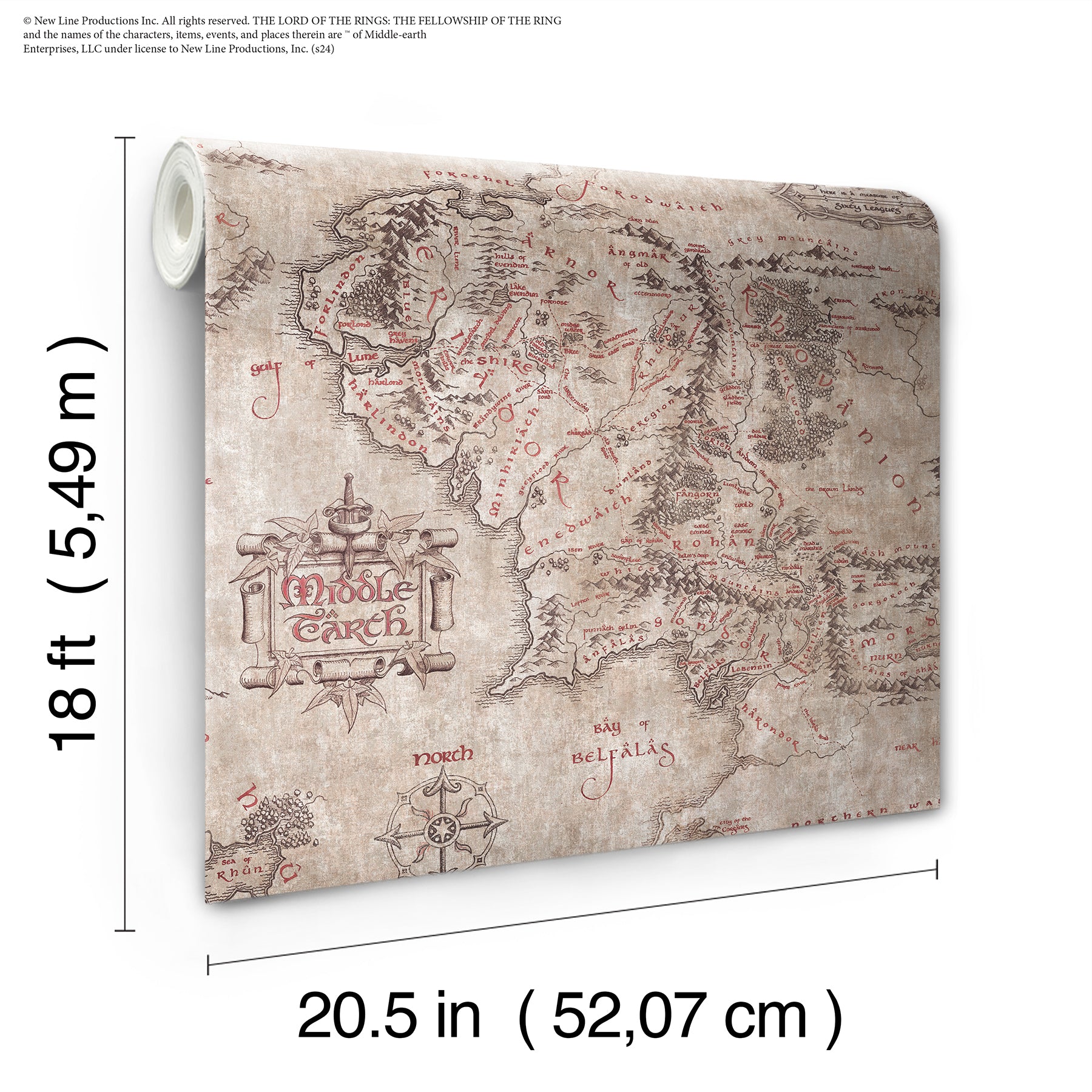 Size : Officially-licensed parchment-hued Lord of the Rings Middle Earth map peel and stick wallpaper.Peel and stick to apply, pull up to remove.Warner Bros wall decals by RoomMates is safe for walls and leaves no sticky residue behind.Easily repositionable while installing.Warner Bros wall decals by RoomMates sticks to any smooth, flat surface - perfect for DIY projects.Ideal for rental or home decorating.Comes on a 20.5-in x 18-ft roll and covers about 30.75 sq. ft.Design repeat of 20.5-in.This product should NOT be applied to textured walls - smooth clean, dry, painted surface only (no Non-Stick paint or soap residue)