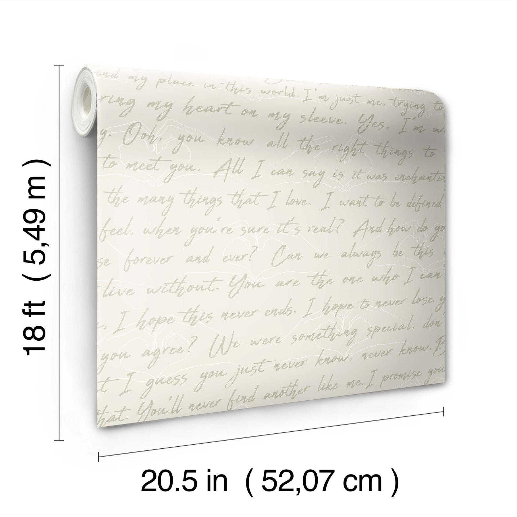 Size : Parchment hued peel and stick wallpaper featuring scripted quotes through eras of romance atop a hand heart backdrop.Peel and stick to apply, pull up to remove.RoomMates is safe for walls and leaves no sticky residue behind.Easily repositionable while installing.RoomMates sticks to any smooth, flat surface - perfect for DIY projects.Ideal for rental or home decorating.Comes on a 20.5-in x 18-ft roll and covers about 30.8 sq. ft.Design repeat of 20.5-in.This product should NOT be applied to textured walls - smooth clean, dry, painted surface only (no Non-Stick paint or soap residue)