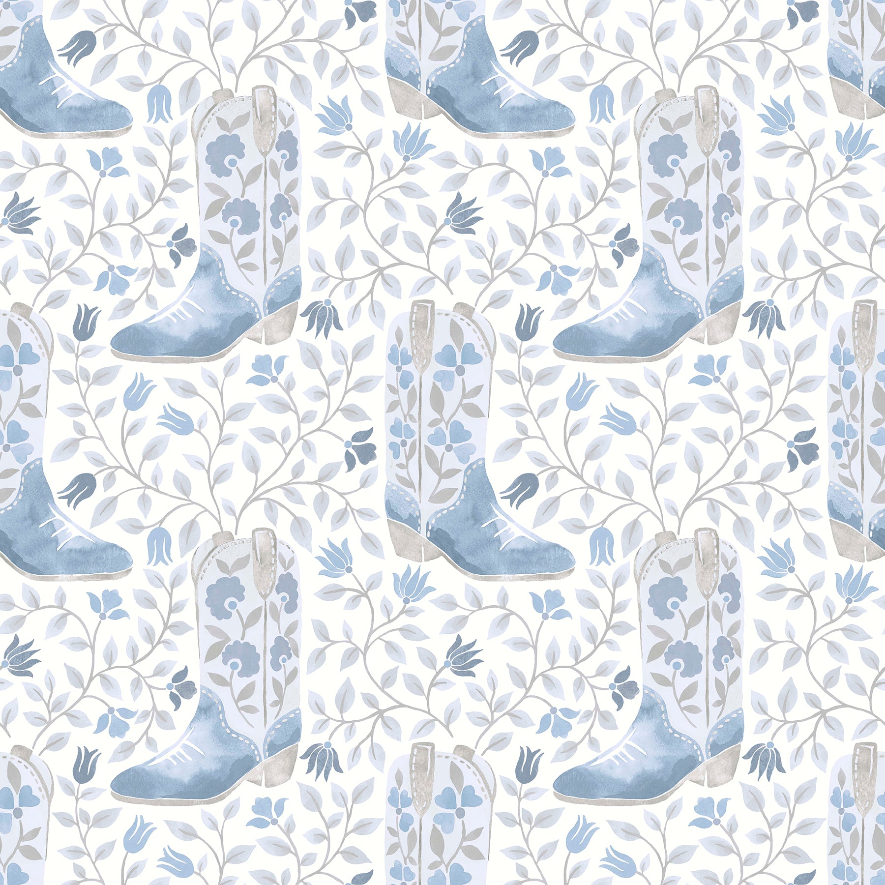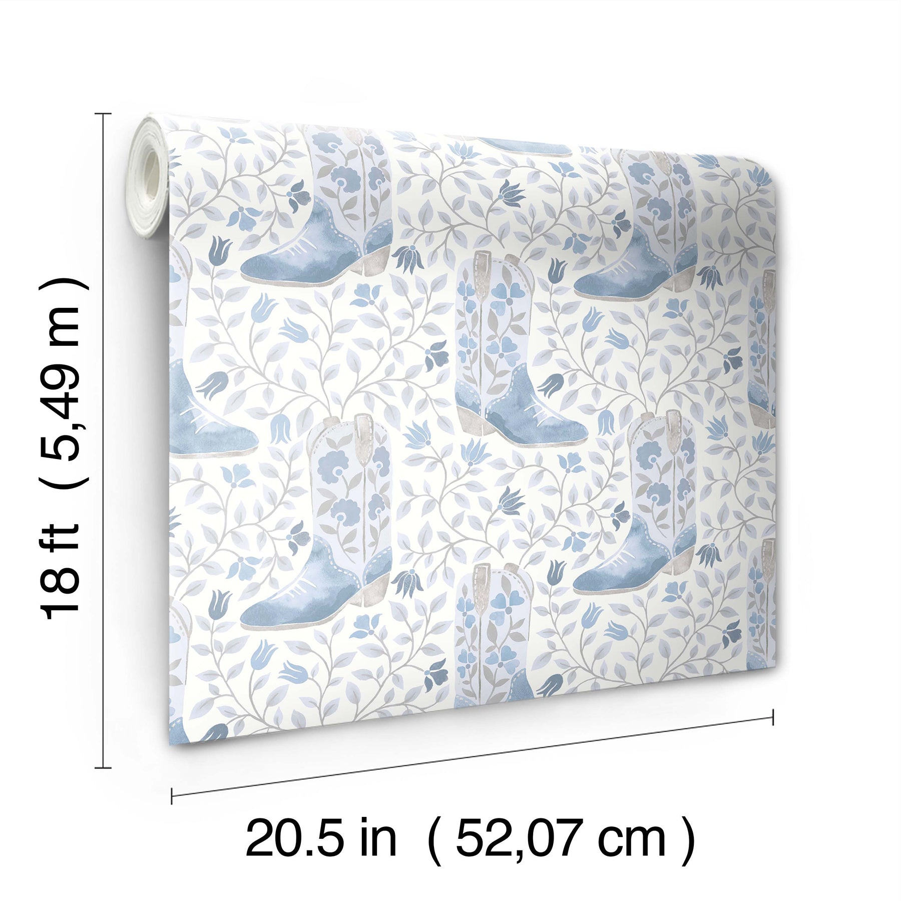 Use:Cowgirl chic and cute as can be in just Peel, Stick?Done!? Charming blue cowboy boots and blossoming vines trail atop a white backdrop in this peel and stick wallpaper print. Cowgirl Like Me Blue Peel and Stick Wallpaper comes on one roll that measures 20.5 inches wide by 18 feet long.
