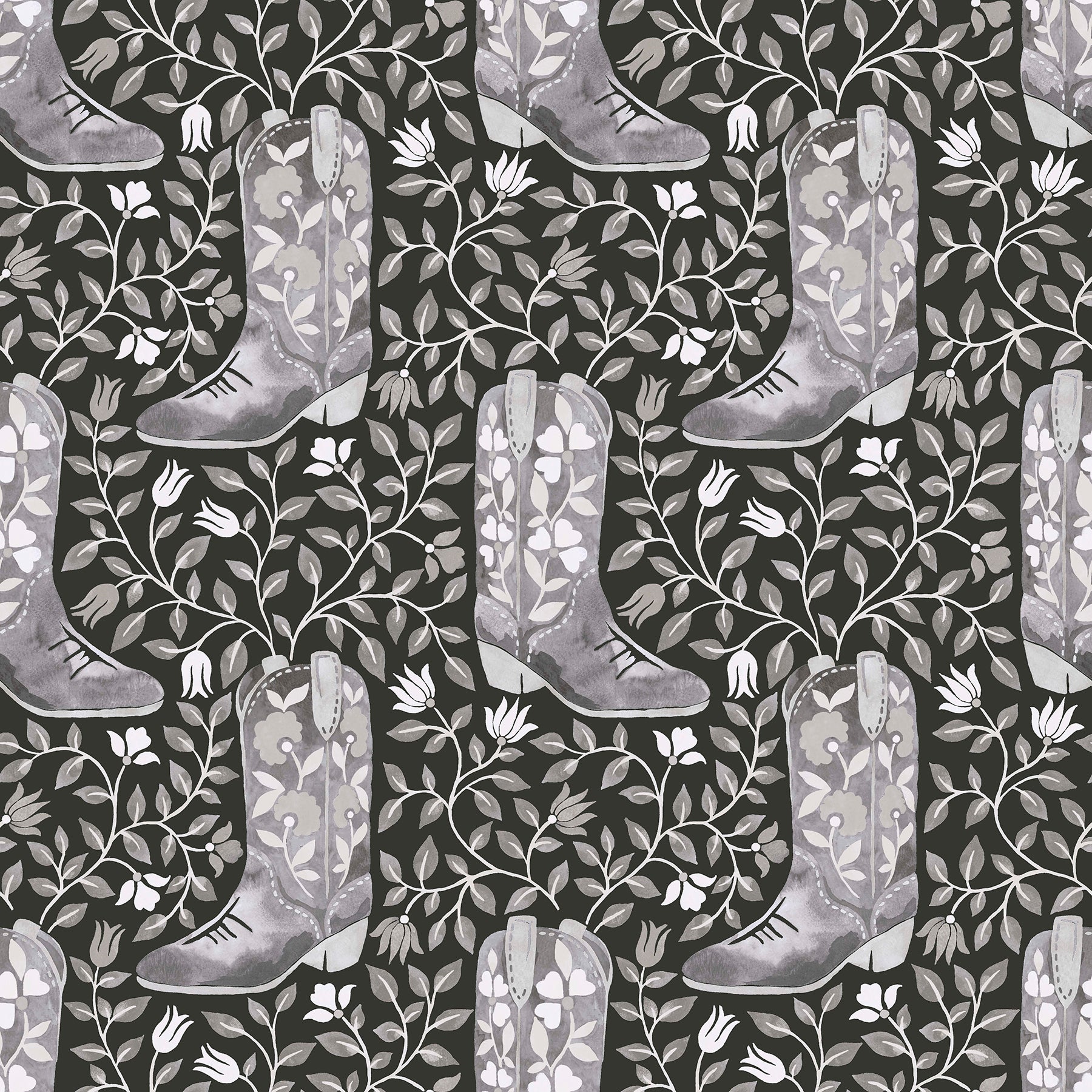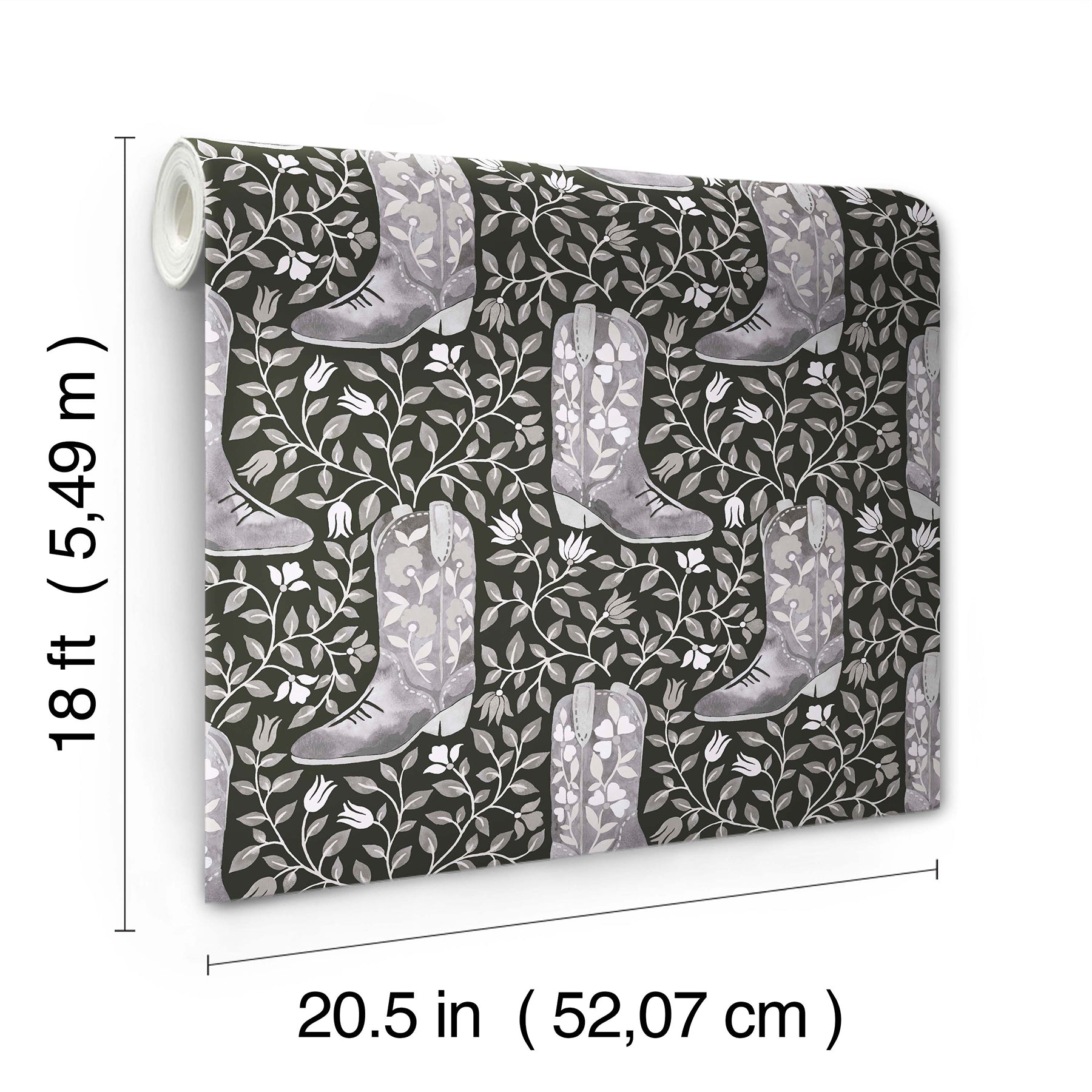 Size : Black and grey floral cowboy boot peel and stick wallpaper print.Peel and stick to apply, pull up to remove.RoomMates is safe for walls and leaves no sticky residue behind.Easily repositionable while installing.RoomMates sticks to any smooth, flat surface - perfect for DIY projects.Ideal for rental or home decorating.Comes on a 20.5-in x 18-ft roll and covers about 30.8 sq. ft.Design repeat of 10.25-in.This product should NOT be applied to textured walls - smooth clean, dry, painted surface only (no Non-Stick paint or soap residue)