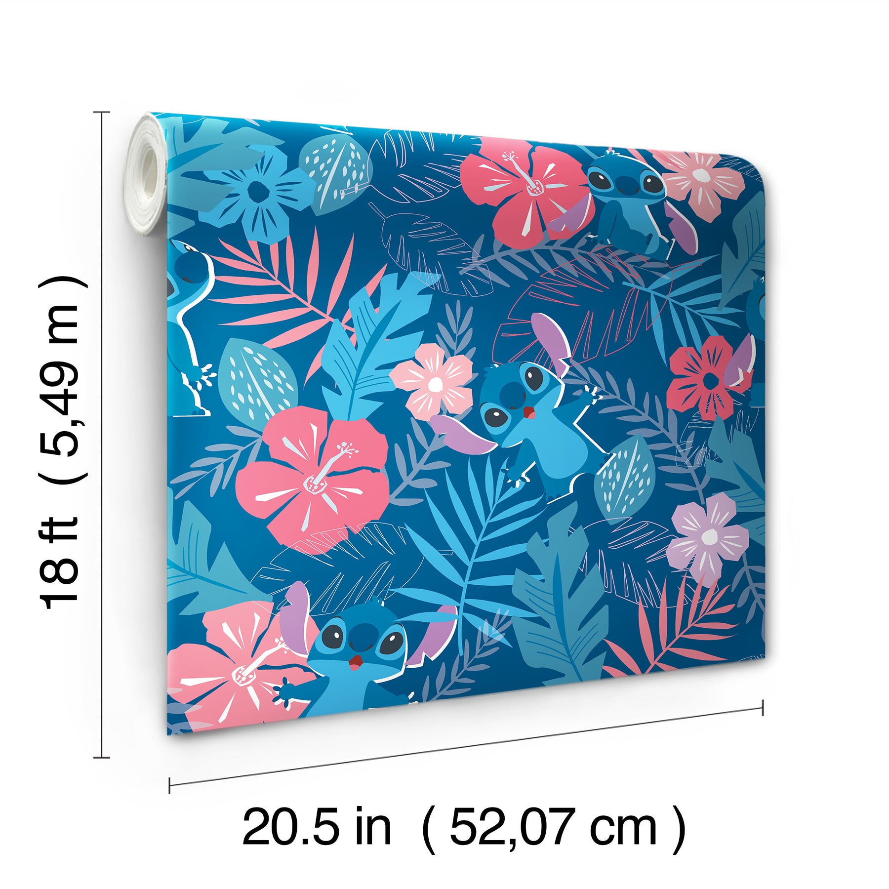 Use:Say aloha to adorable walls! This tropical peel and stick wallpaper pattern features Disney?s Stitch among a blossoming assortment of island-inspired foliage in shades of blue and pink. Disney Stitch Tropical Flowers Blue Peel and Stick Wallpaper comes on one roll that measures 20.5 inches wide by 18 feet long.