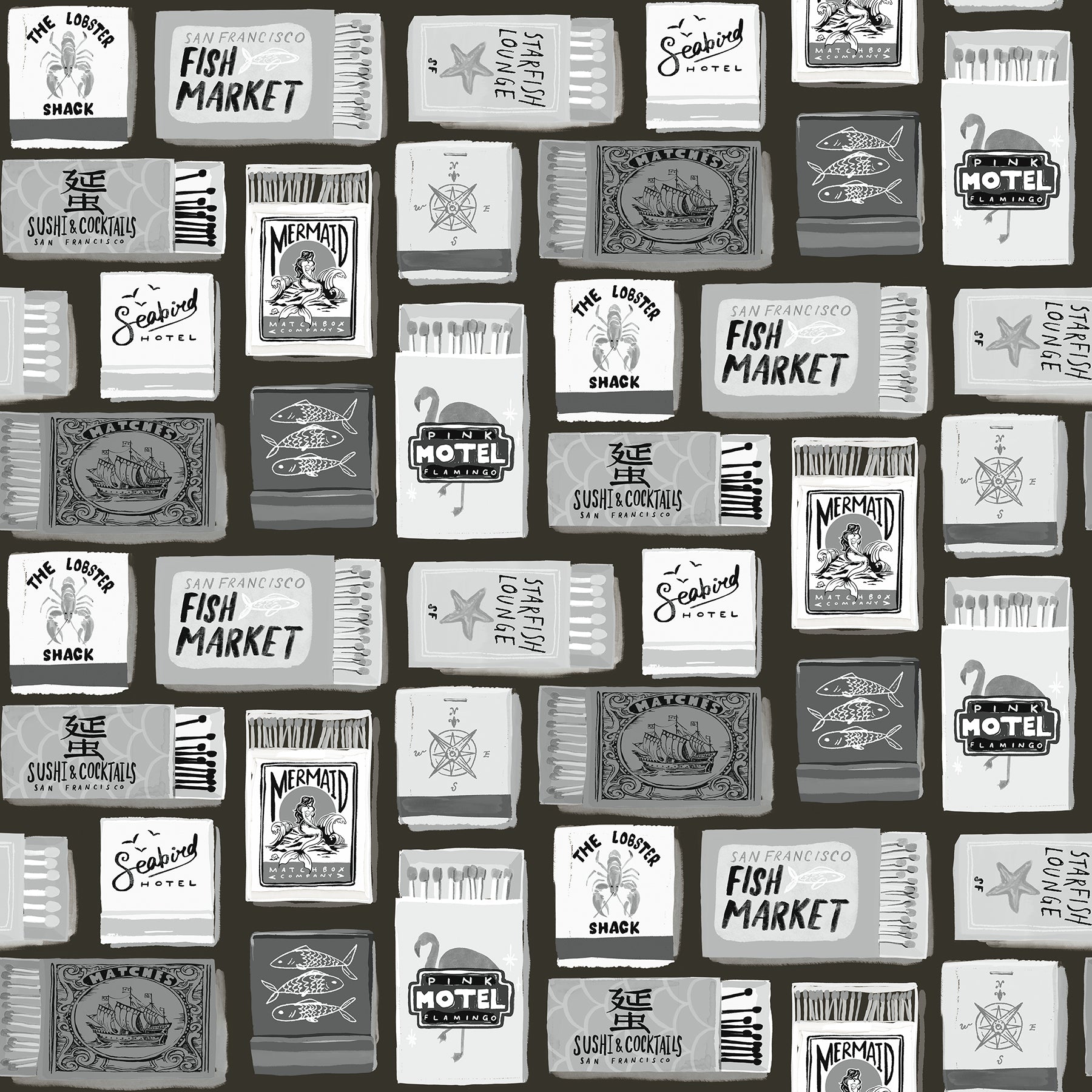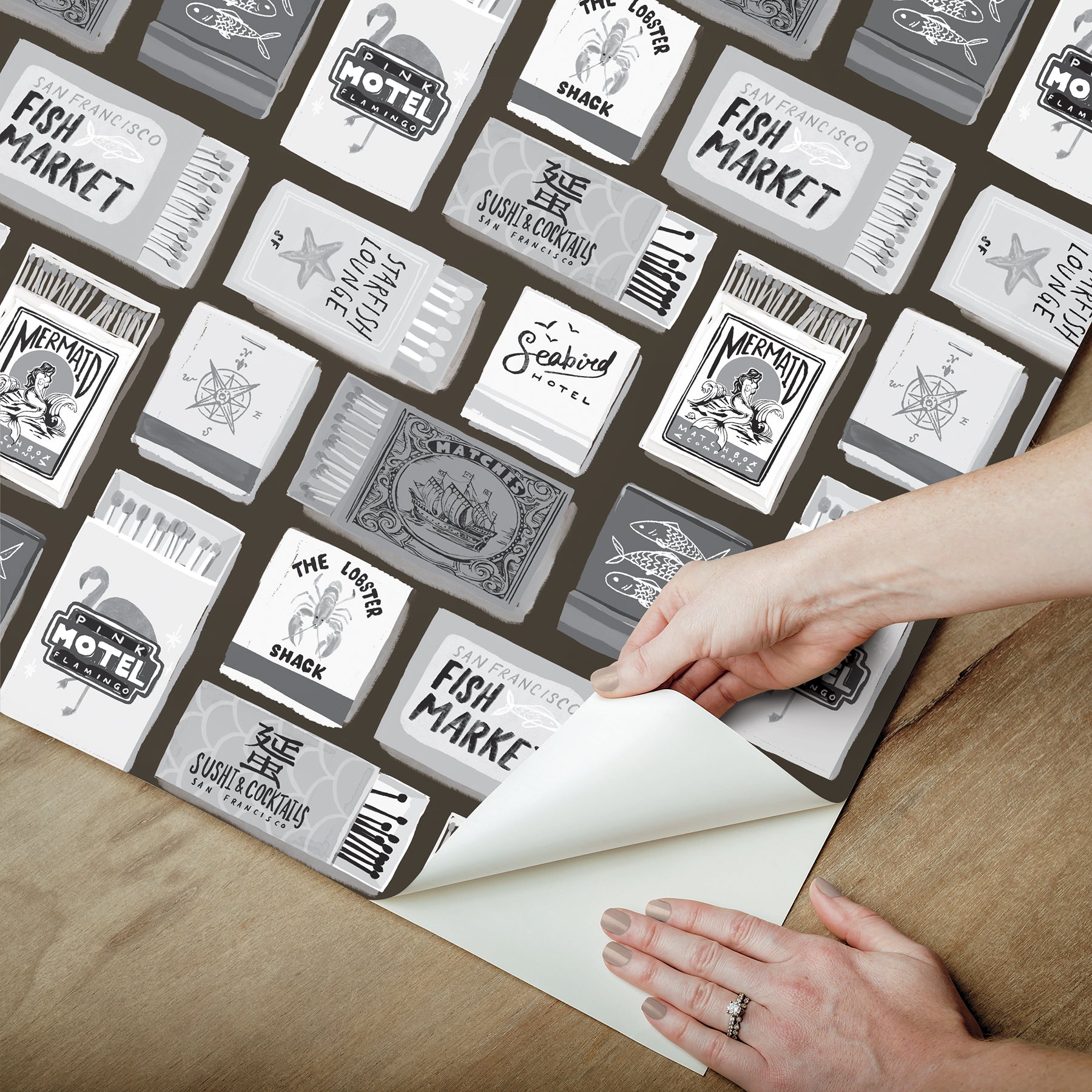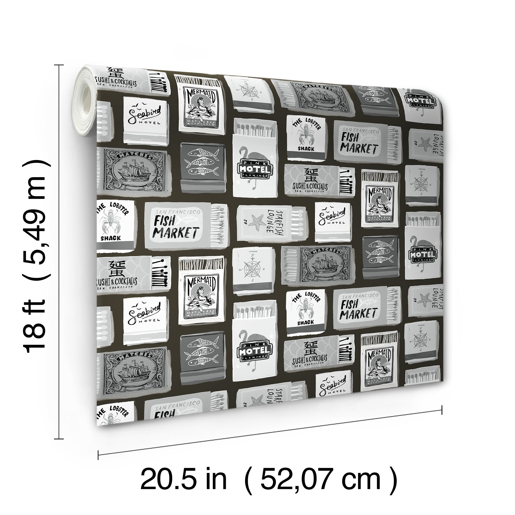Use:Strike up some style with this wonderfully-kitschy matchbox peel and stick wallpaper. Featuring assorted black and white nautical matchboxes, this whimsical pattern charms up any space in just Peel, Stick?Done!? The Perfect Match Black Peel and Stick Wallpaper comes on one roll that measures 20.5 inches wide by 18 feet long.