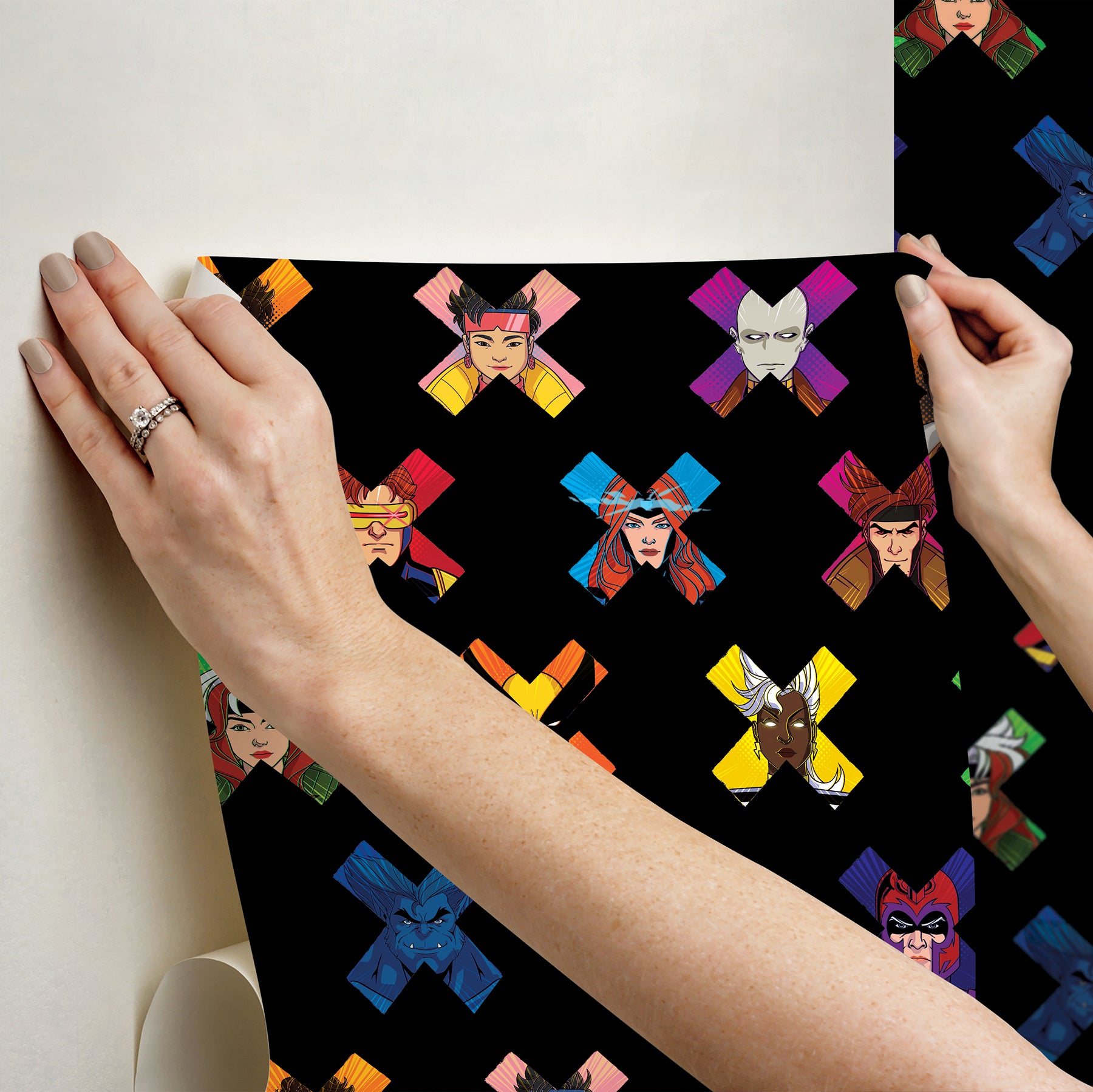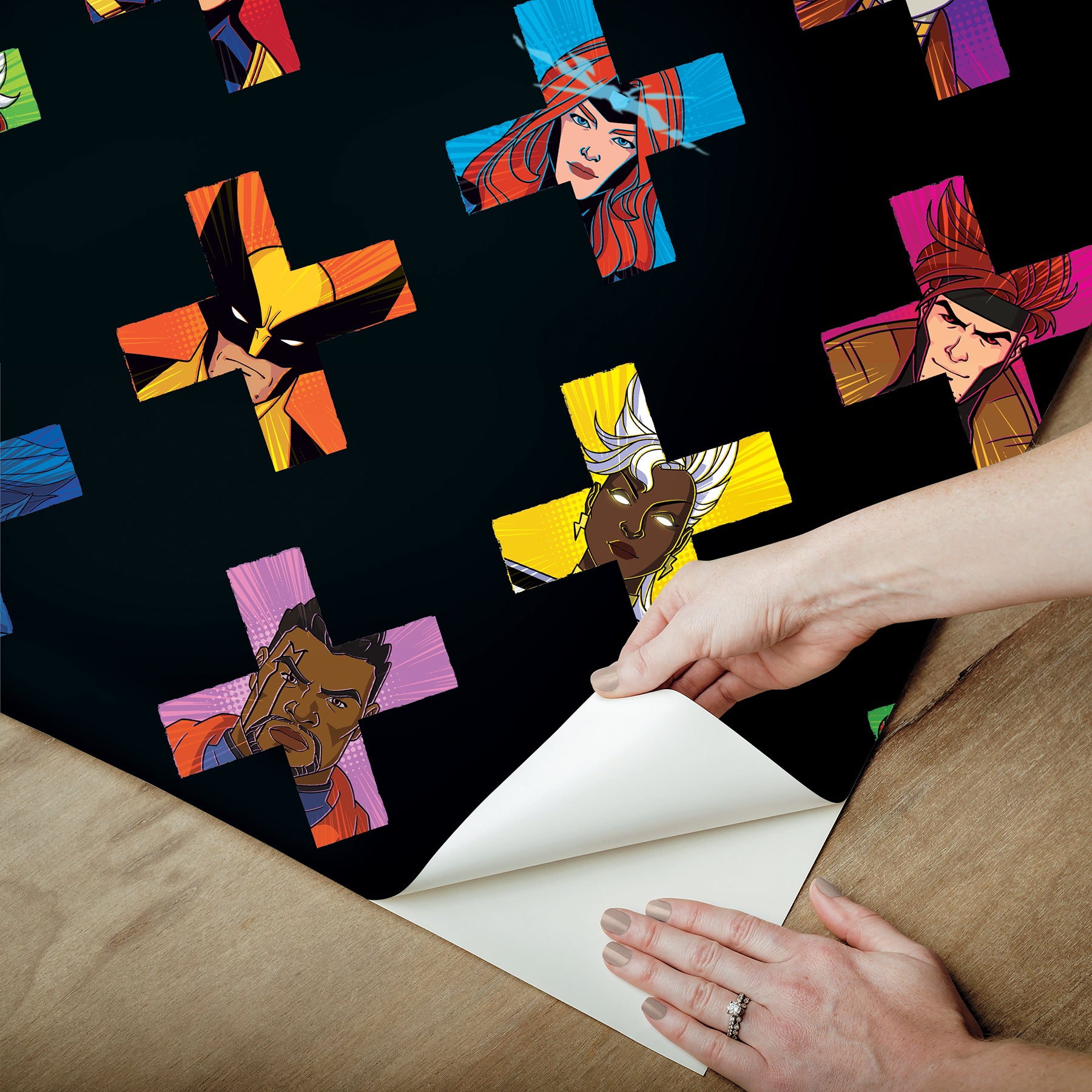 Use:Answer the call to action with this Marvel X-Men '97 peel and stick wallpaper! Set against a bold black backdrop, this design features your favorite mutants?like Wolverine, Storm, Rogue, and Cyclops?appearing through stylized X-shaped frames. Each character pops with vibrant color and energy, capturing the spirit of the beloved animated series. X-MEN '97 Faces Black Peel and Stick Wallpaper comes on one roll that measures 20.5 inches wide by 18 feet long. Marvel Animation's X-Men '97 peel and stick wallpaper features the mutants Wolverine, Storm, Rogue, and Cyclops in X-shaped windows over a black backdrop; Peel and stick to apply, pull up to remove; Roommates peel and stick wallpaper is safe for walls and leaves no sticky residue behind; Easily repositionable while installing; Roommates peel and stick wallpaper sticks to any smooth, flat surface - perfect for DIY projects; Ideal for rental or home decorating; Comes on a 20.5-in x 18-ft roll and covers about 30.75 sq. ft; Design repeat of 20.5-in; This product should NOT be applied to textured walls - smooth clean, dry, painted surface only (no Non-Stick paint or soap residue).