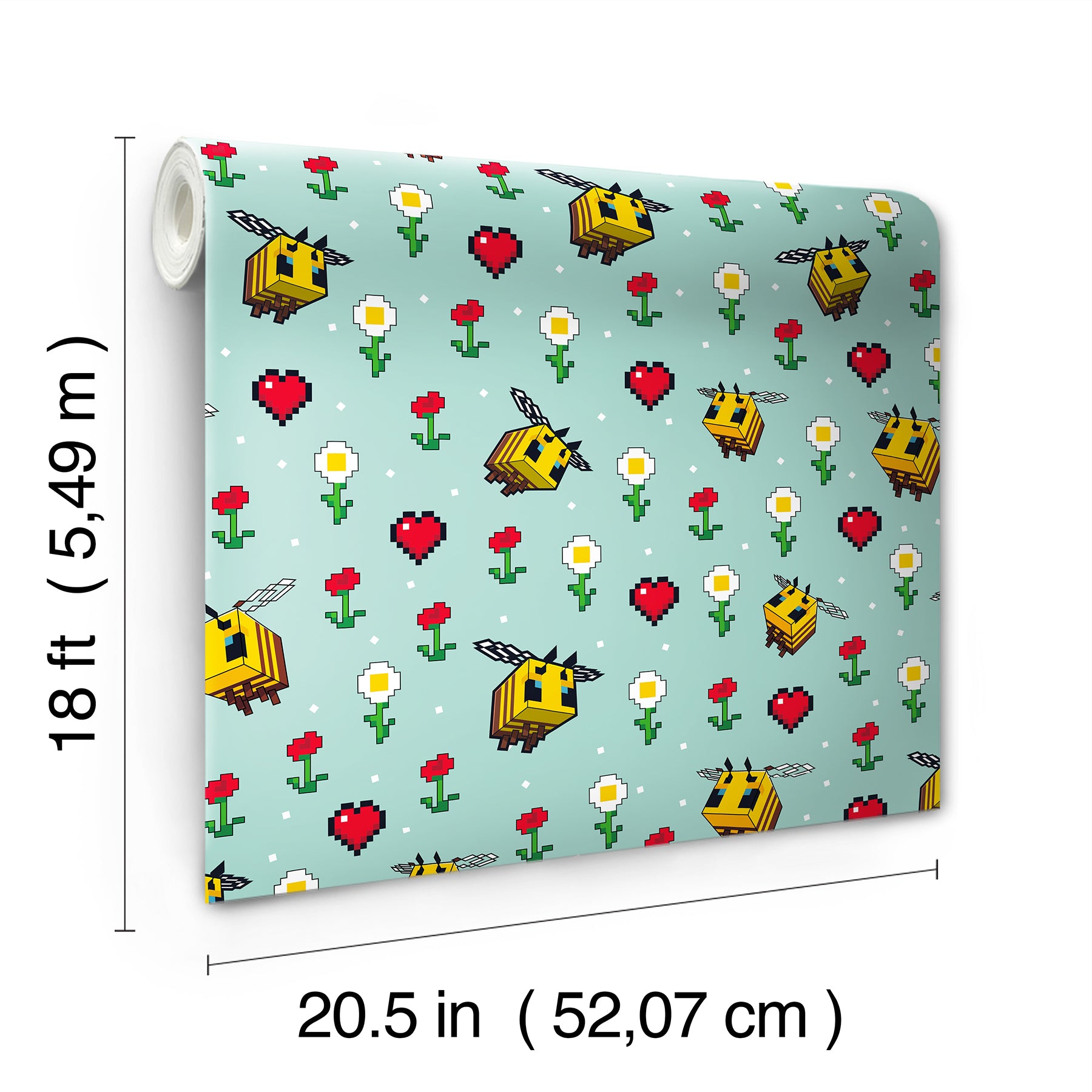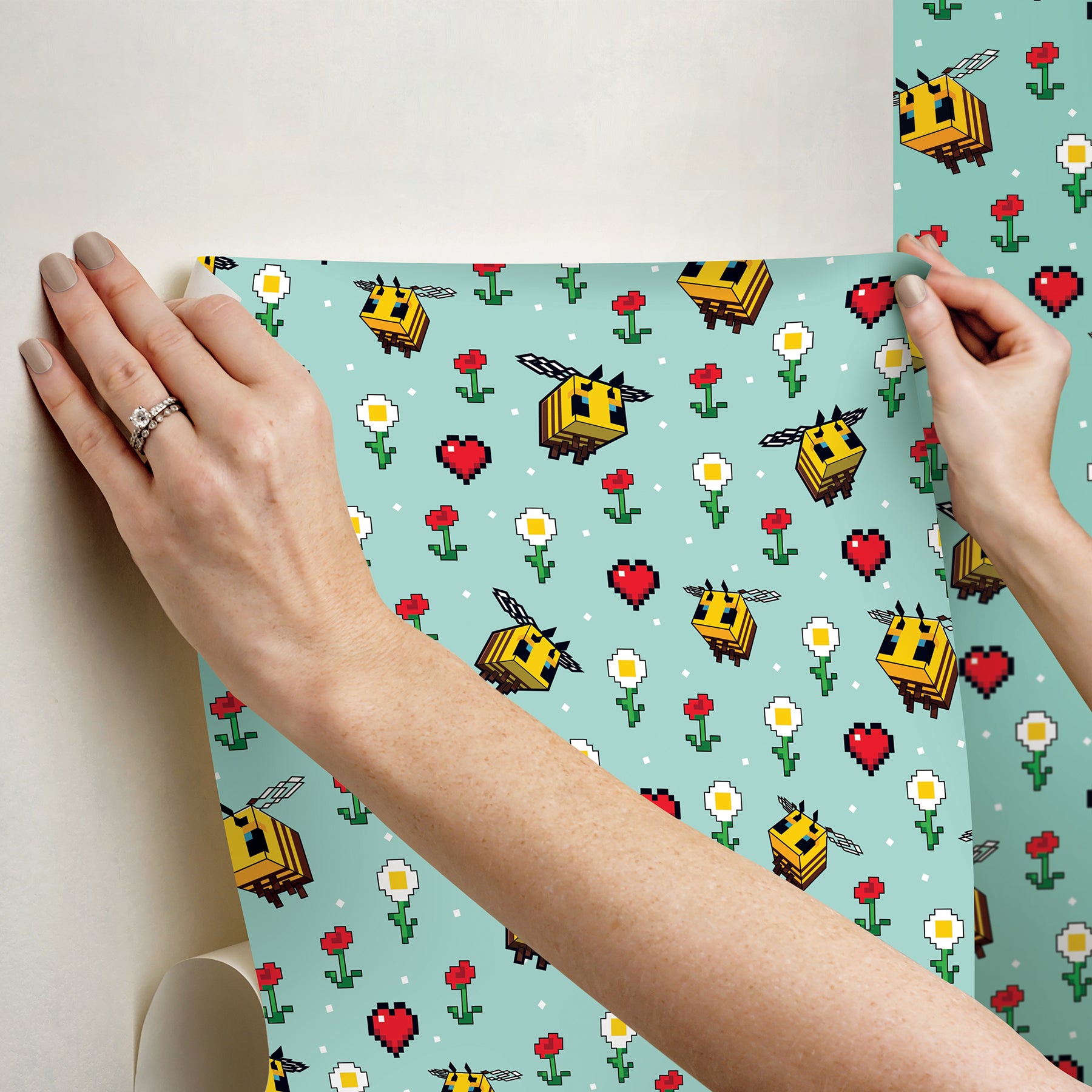 Use:Add a playful touch of whimsy to your space with this officially-licensed Minecraft Busy Bee Blue peel and stick wallpaper! Pixelated bees hover across a blue background, surrounded by white and red flowers and charming hearts, creating a cute garden scene. Minecraft Busy Bee Blue Peel and Stick Wallpaper comes on one roll that measures 20.5 inches wide by 18 feet long. Officially-licensed Minecraft peel and stick wallpaper featuring pixelated bees, flowers and hearts on a charming blue background; Peel and stick to apply, pull up to remove; Roommates is safe for walls and leaves no sticky residue behind; Easily repositionable while installing; Roommates sticks to any smooth, flat surface - perfect for DIY projects; Ideal for rental or home decorating; Comes on a 20.5-in x 18-ft roll and covers about 30.75 sq. ft; Design repeat of 20.5-in; This product should NOT be applied to textured walls - smooth clean, dry, painted surface only (no Non-Stick paint or soap residue).