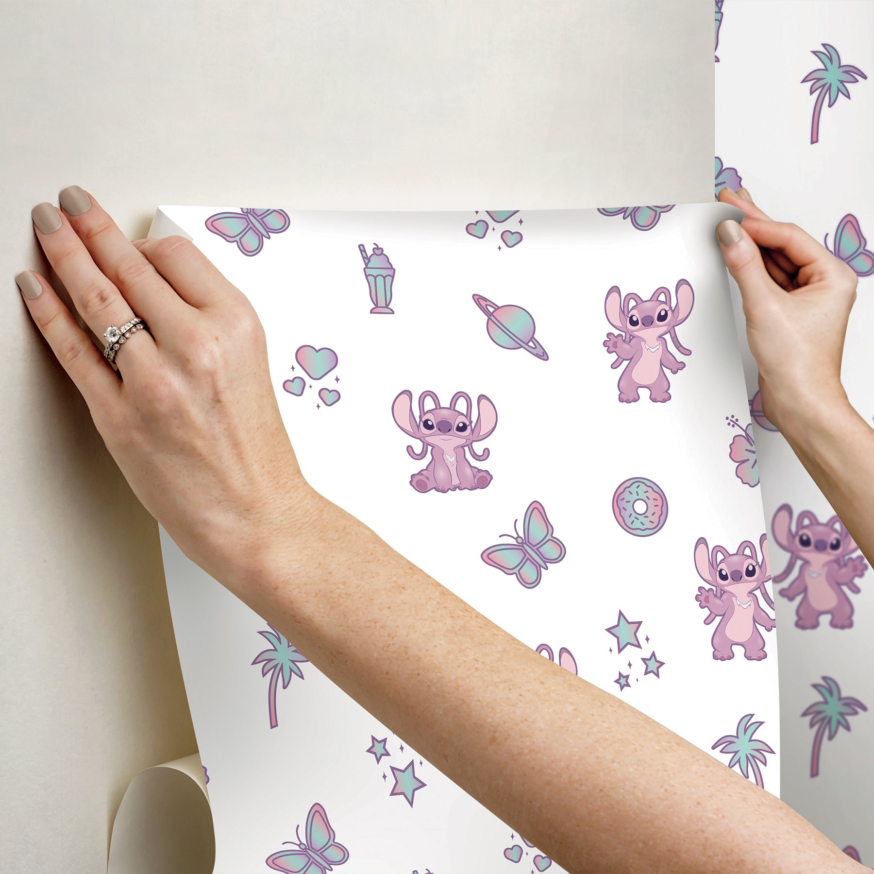 Use:This officially licensed Disney's Lilo & Stitch Angel Peel & Stick Wallpaper is the perfect design featuring the character, Angel, with butterflies, flowers, stars and more! Disney Lilo & Stitch Angel Pink Peel and Stick Wallpaper comes on one roll that measures 20.5 inches wide by 18 feet long. The Aloha spirit of Disney's Lilo & Stitch Angel Peel & Stick Wallpaper is the perfect design featuring Stitch, butterflies, flowers, stars and more! ; Peel and stick to apply, pull up to remove; Roommates is safe for walls and leaves no sticky residue behind; Easily repositionable while installing; Roommates sticks to any smooth, flat surface - perfect for DIY projects; Ideal for rental or home decorating; Comes on a 20.5-in x 18-ft roll and covers about 30.8 sq. ft; Design repeat of 20.5-in; This product should NOT be applied to textured walls - smooth clean, dry, painted surface only (no Non-Stick paint or soap residue).