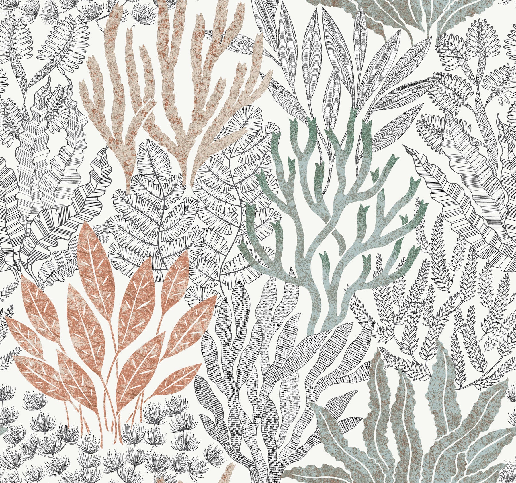 Use:Coral Leaves reimagines the sea floor with a combination simple black and white linework and unframed terracotta, taupe, aqua and sea green fronds. This Coral Leaves Wallpaper measures approximately 27 inches wide by 27 feet long, measuring approximately 60.8 square feet per roll. The quintessential design for timeless romance, toile (pronounced ?twall?) traces its origins to 18th century fabrics. This celebrated motif is explored with a range of classical reproductions and modern reimaginings.