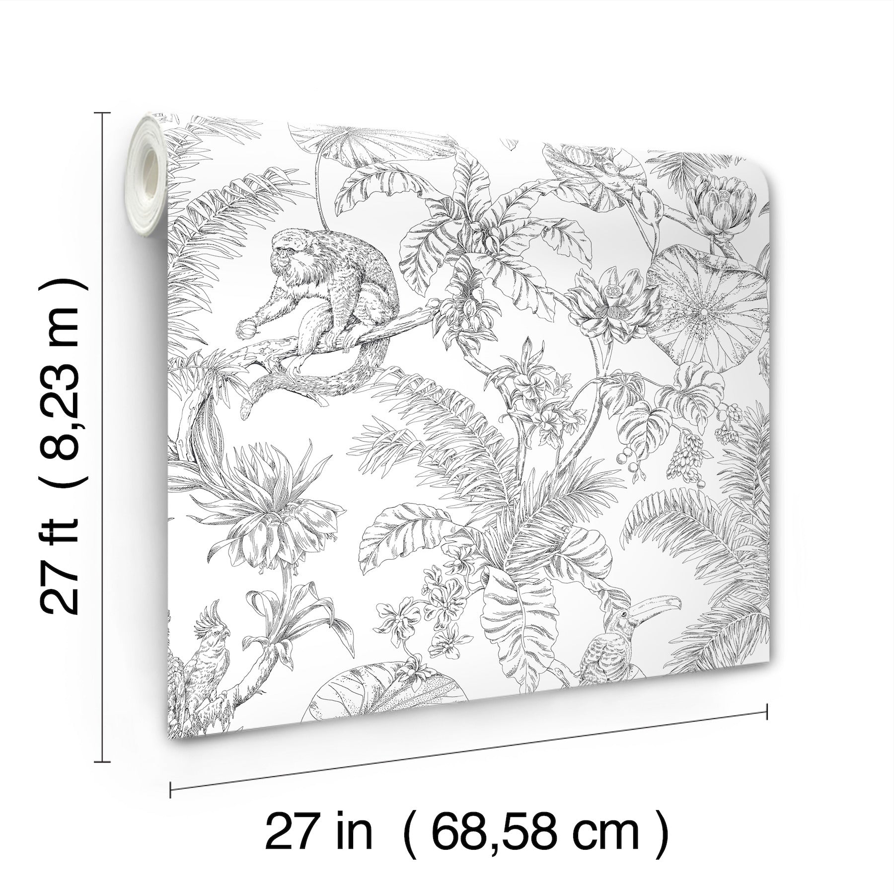 Use:The simple and airy stylings of Tropical Sketch Toile are inked in thin lines of black against white. This Tropical Sketch Toile Wallpaper measures approximately 27 inches wide by 27 feet long, measuring approximately 60.8 square feet per roll. The quintessential design for timeless romance, toile (pronounced ?twall?) traces its origins to 18th century fabrics. This celebrated motif is explored with a range of classical reproductions and modern reimaginings.