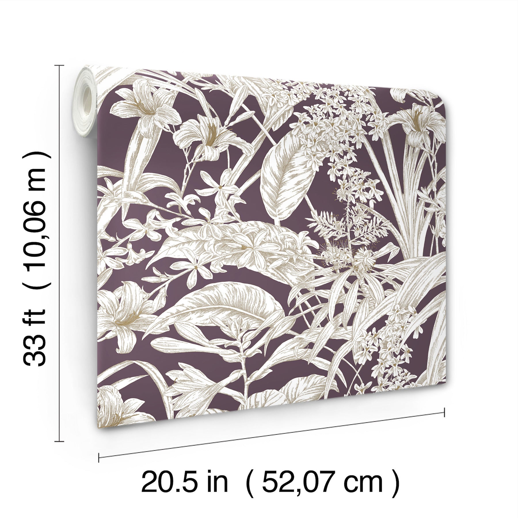 Use:The tropical tranquility of Orchid Conservatory Toile is created with layers of white flora delicatly detailed with golden brown inks and metallic gold touches, allrichly offset by deep mulberry. This Orchid Conservatory Toile Wallpaper measures approximately 20.5 inches wide by 33 feet long, measuring approximately 56.4 square feet per roll. The quintessential design for timeless romance, toile (pronounced ?twall?) traces its origins to 18th century fabrics. This celebrated motif is explored with a range of classical reproductions and modern reimaginings.