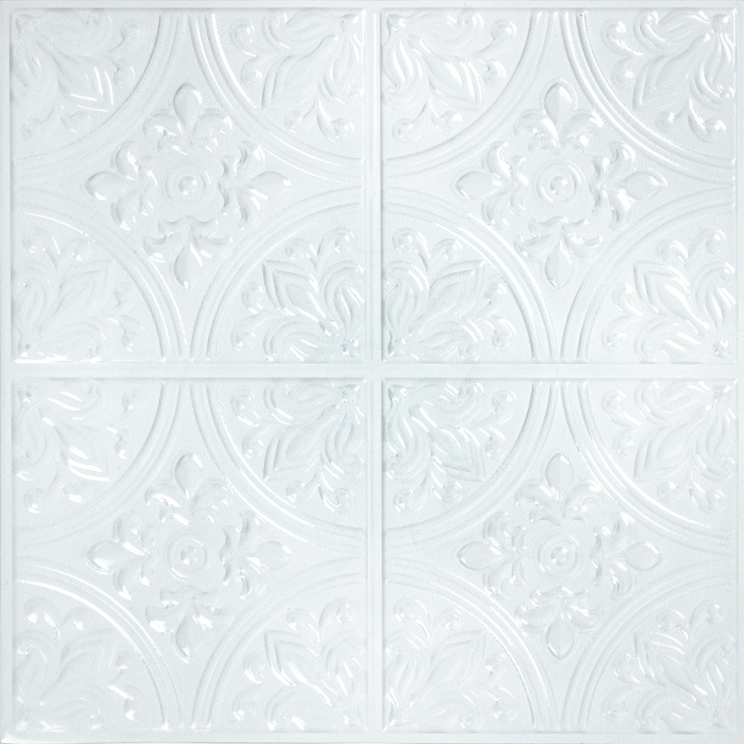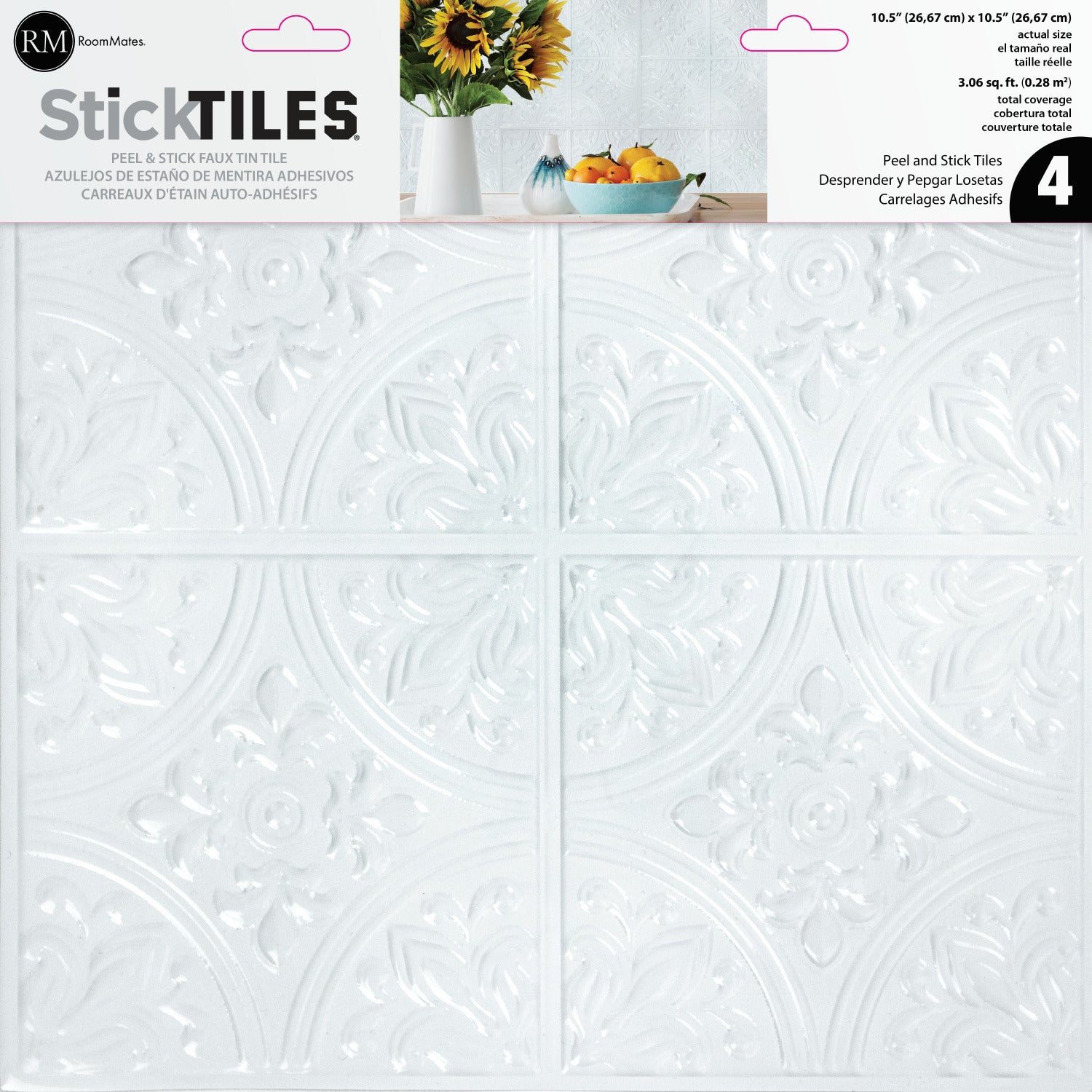 Use:The classic beauty of Victorian Tin Tiles is interpreted into easy and affordable current design with these Bright White Tin Tiles peel and stick StickTiles from RoomMates. Originally designed to imitate the exquisite ceiling plasterwork of grand European homes, faux pressed tin designs are now fashionably used for art-work, back splashes, cabinet faces, wainscoting and more. The 3D/embossed design elements within the tile capture timeless motifs like the fleur de lis, acanthus scrolls, medallions and architectural gridwork. A crisp, bright white glossy finish makes these StickTiles the perfect accompaniment to any home dcor.