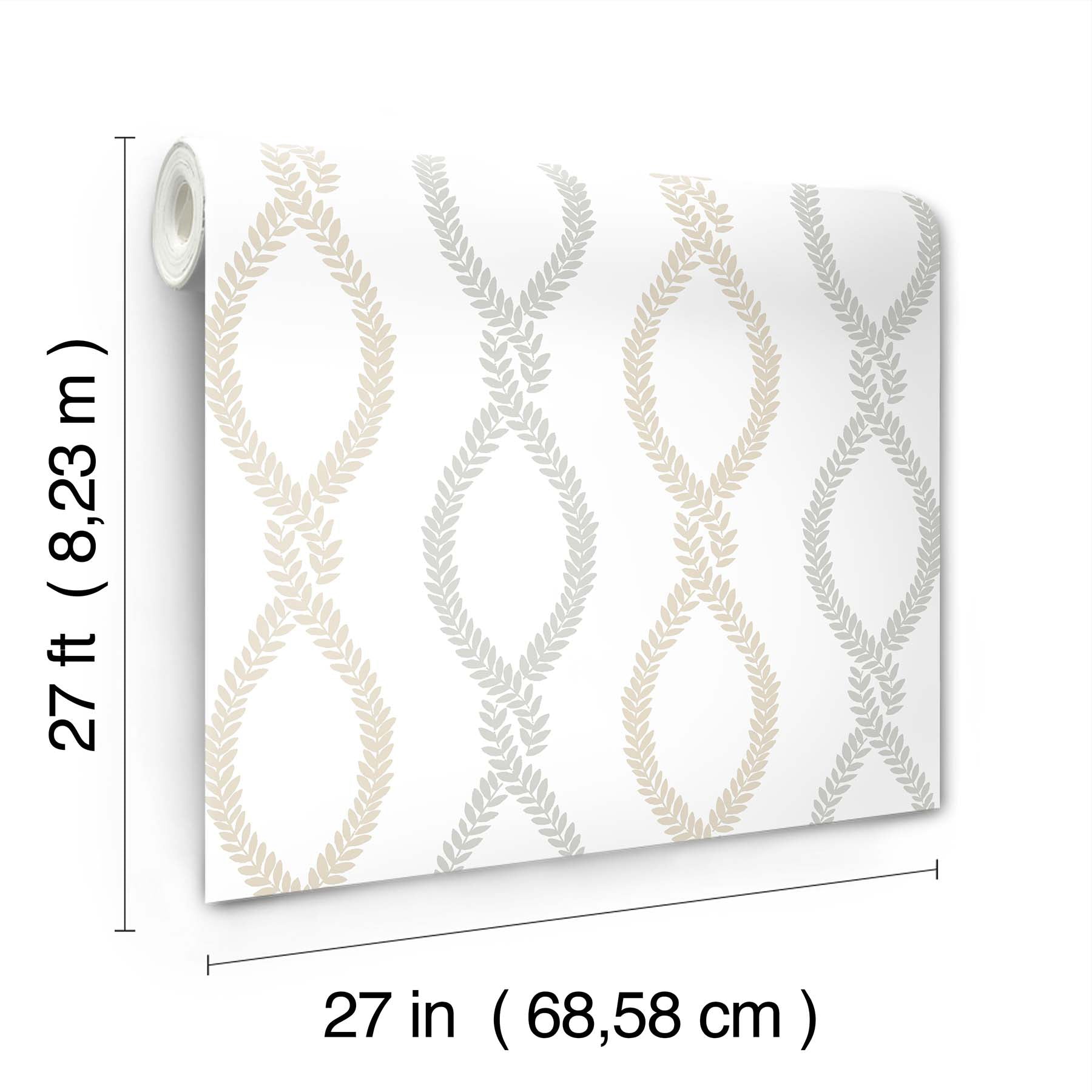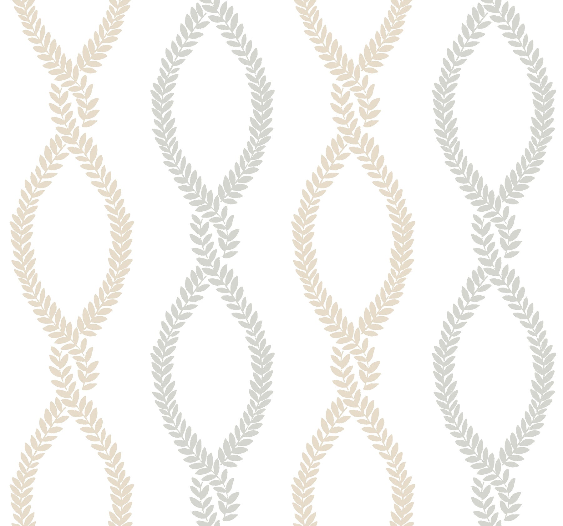 Use:Pairs of leafy vines twist and twine together to form a looping chain in pattern Laureate. Featured here in a palette of pale grey, beige, and white. Laureate is an unpasted, non woven wallpaper measuring 27 inches wide by 27 feet long, covering approximately 60.8 square feet per roll. Unpasted non woven material; 25.3-in repeat, straight match; Washable and strippable; 27-in by 27-ft long roll; Covers about 60.8 square feet