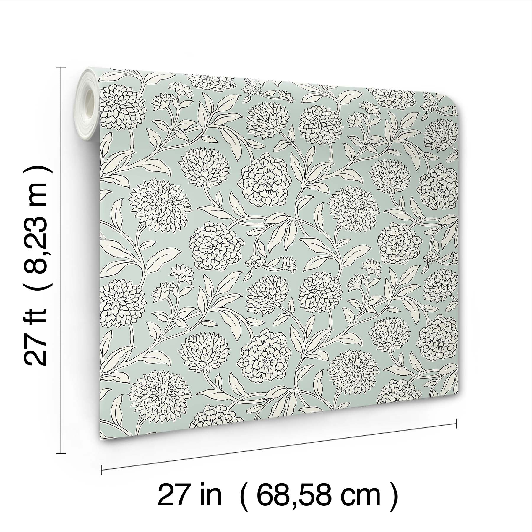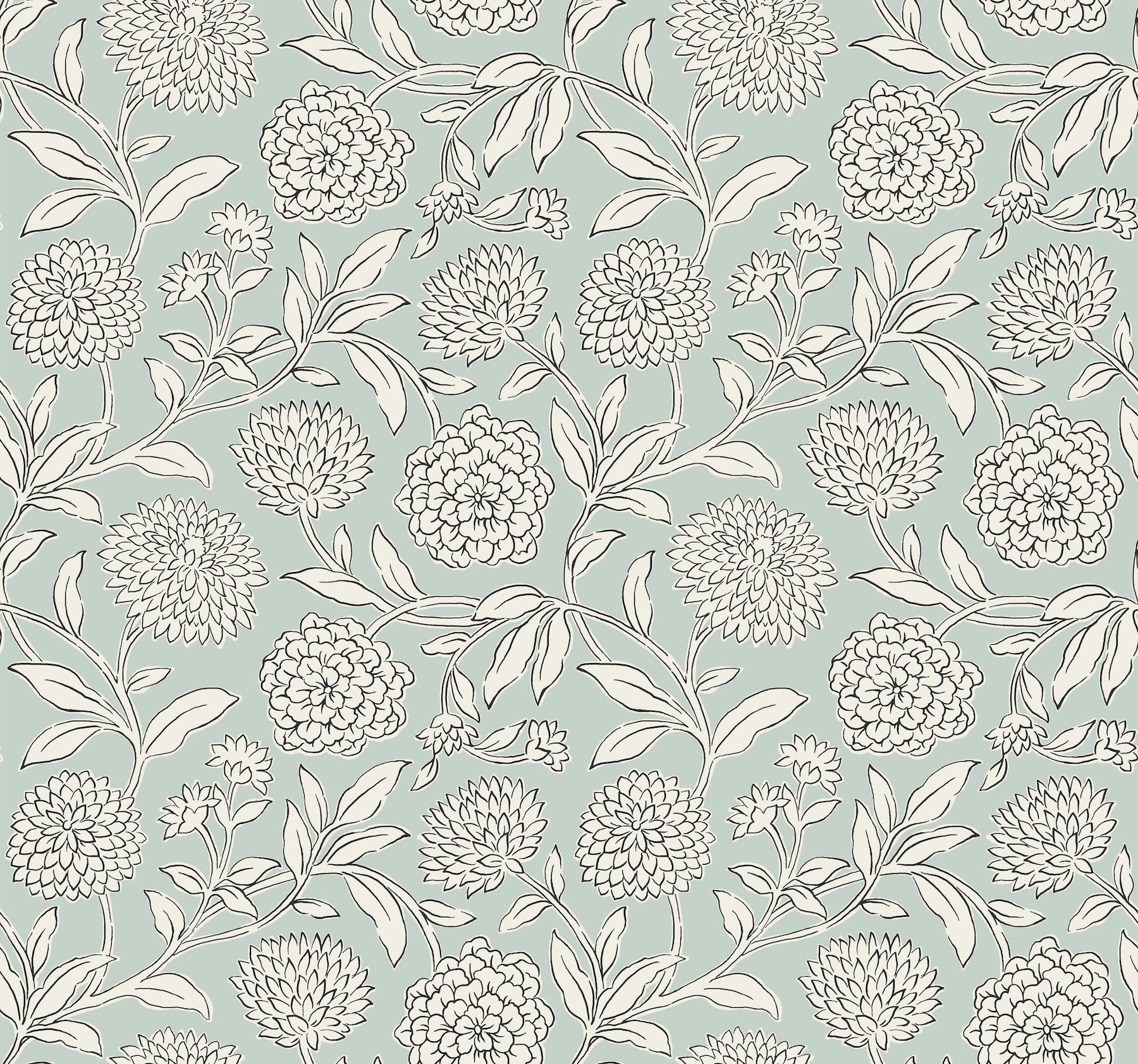 Use:Dreamy dahlias burst into bloom along winding stems, the simple illustrative style giving pattern Chatsworth Garden added charm. Seen here inked in white and black against a pale blue backdrop. Chatsworth Garden is an unpasted, non woven wallpaper measuring 27 inches wide by 27 feet long, covering approximately 60.8 square feet per roll. Unpasted non woven material; 25.3-in repeat, straight match; Washable and strippable; 27-in by 27-ft long roll; Covers about 60.8 square feet