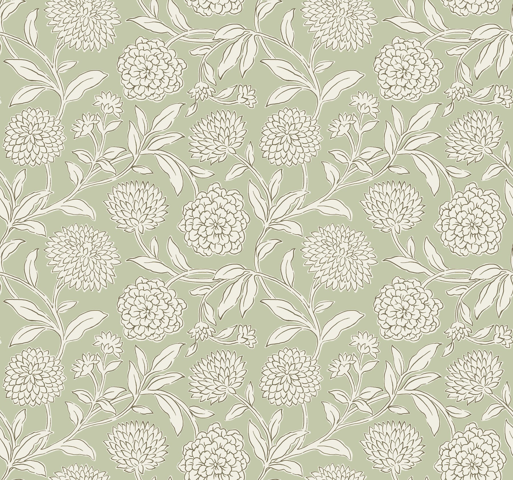 Use:Dreamy dahlias burst into bloom along winding stems, the simple illustrative style giving pattern Chatsworth Garden added charm. Seen here inked in white and grey against a soft green backdrop. Chatsworth Garden is an unpasted, non woven wallpaper measuring 27 inches wide by 27 feet long, covering approximately 60.8 square feet per roll. Unpasted non woven material; 25.3-in repeat, straight match; Washable and strippable; 27-in by 27-ft long roll; Covers about 60.8 square feet