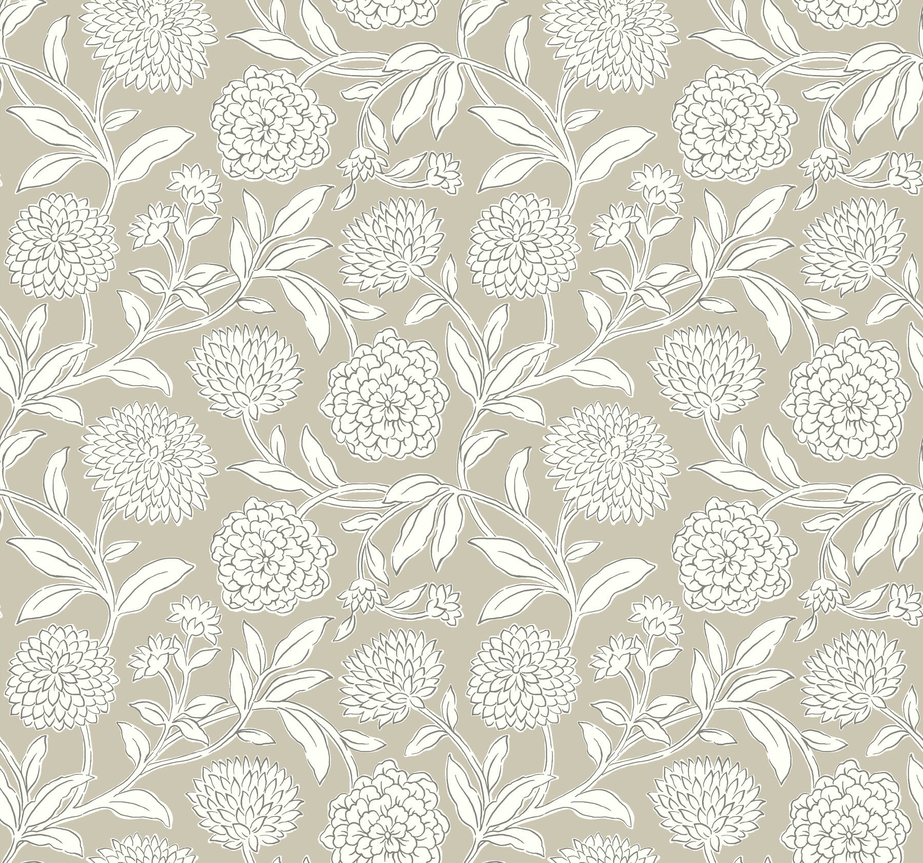Use:Dreamy dahlias burst into bloom along winding stems, the simple illustrative style giving pattern Chatsworth Garden added charm. Seen here inked in white and grey against a taupe backdrop. Chatsworth Garden is an unpasted, non woven wallpaper measuring 27 inches wide by 27 feet long, covering approximately 60.8 square feet per roll. Unpasted non woven material; 25.3-in repeat, straight match; Washable and strippable; 27-in by 27-ft long roll; Covers about 60.8 square feet