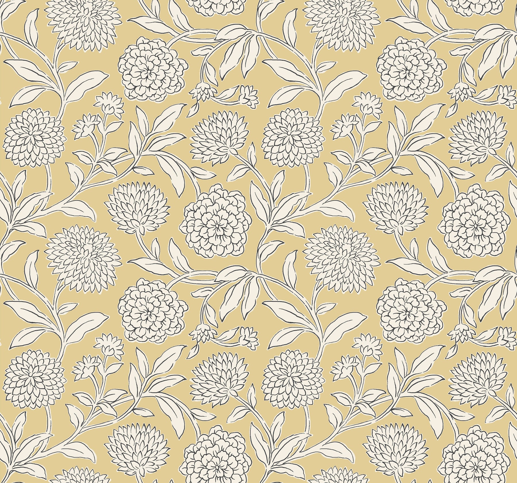 Use:Dreamy dahlias burst into bloom along winding stems, the simple illustrative style giving pattern Chatsworth Garden added charm. Seen here inked in white and black against a pale yellow backdrop. Chatsworth Garden is an unpasted, non woven wallpaper measuring 27 inches wide by 27 feet long, covering approximately 60.8 square feet per roll. Unpasted non woven material; 25.3-in repeat, straight match; Washable and strippable; 27-in by 27-ft long roll; Covers about 60.8 square feet