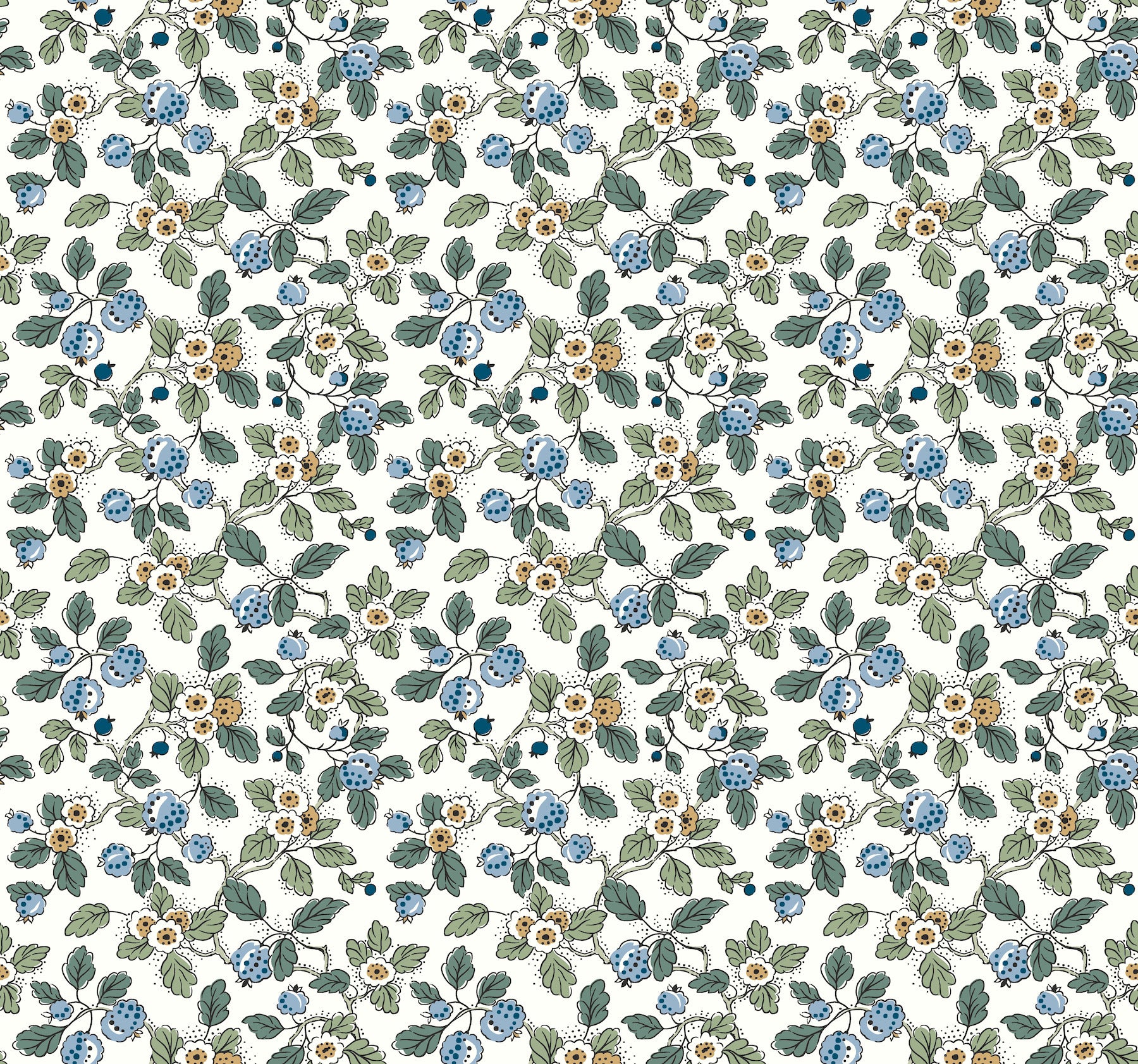 Use:Ripe berries share the vine with floral blooms in the dense greenery of charmingly illustrated pattern Framboise. Featured here with a palette of sky blue, indigo, sea green, light green, butter yellow, and white. Framboise is an unpasted, non woven wallpaper measuring 27 inches wide by 27 feet long, covering approximately 60.8 square feet per roll. Unpasted non woven material; 25.3-in repeat, straight match; Washable and strippable; 27-in by 27-ft long roll; Covers about 60.8 square feet