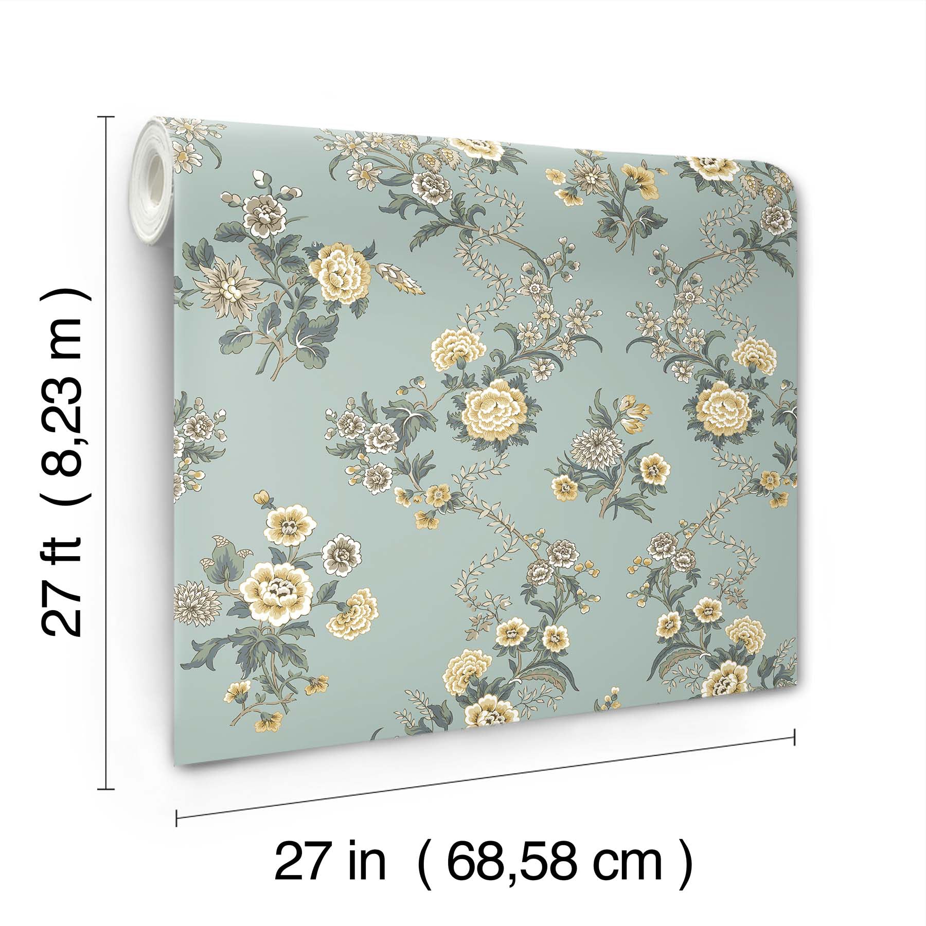 Use:Twining floral vines alternate with hand-picked bouquets for timeless, romantic ambiance in pattern Genevieve. Featured here in a palette of spring and hunter green, golden yellow, beige, taupe, light brown, and white against pale blue. Genevieve is an unpasted, non woven wallpaper measuring 27 inches wide by 27 feet long, covering approximately 60.8 square feet per roll. Unpasted non woven material; 25.3-in repeat, straight match; Washable and strippable; 27-in by 27-ft long roll; Covers about 60.8 square feet