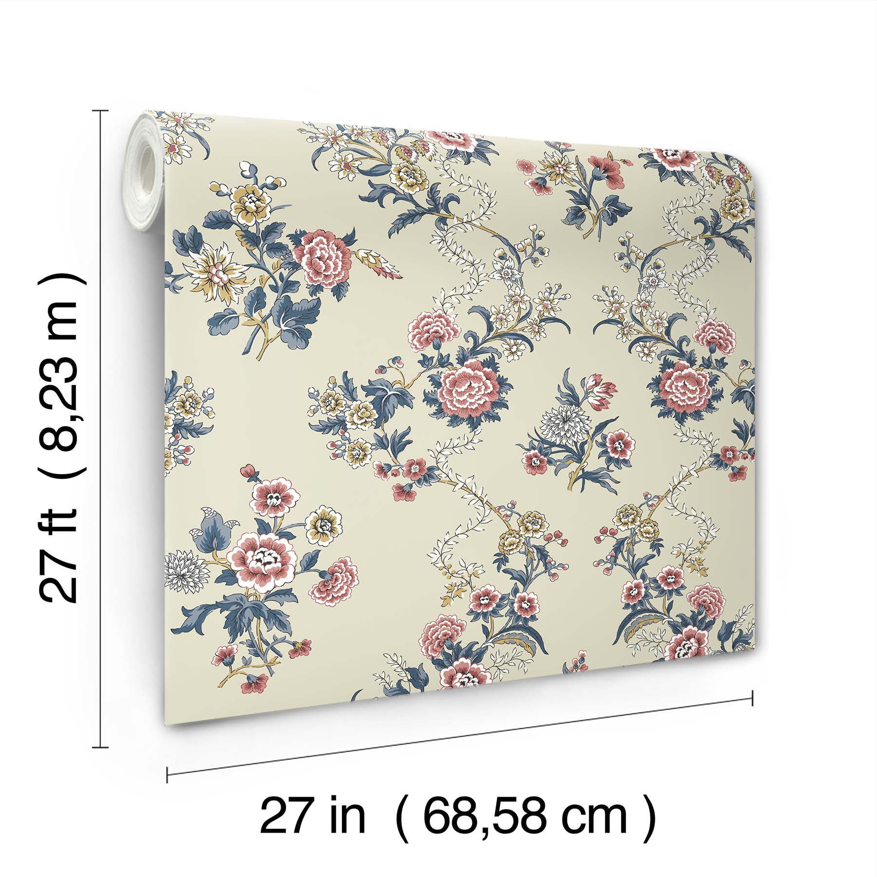 Use:Twining floral vines alternate with hand-picked bouquets for timeless, romantic ambiance in pattern Genevieve. Featured here in a palette of rose, raspberry, navy, denim blue, golden yellow, and white against pale beige. Genevieve is an unpasted, non woven wallpaper measuring 27 inches wide by 27 feet long, covering approximately 60.8 square feet per roll. Unpasted non woven material; 25.3-in repeat, straight match; Washable and strippable; 27-in by 27-ft long roll; Covers about 60.8 square feet