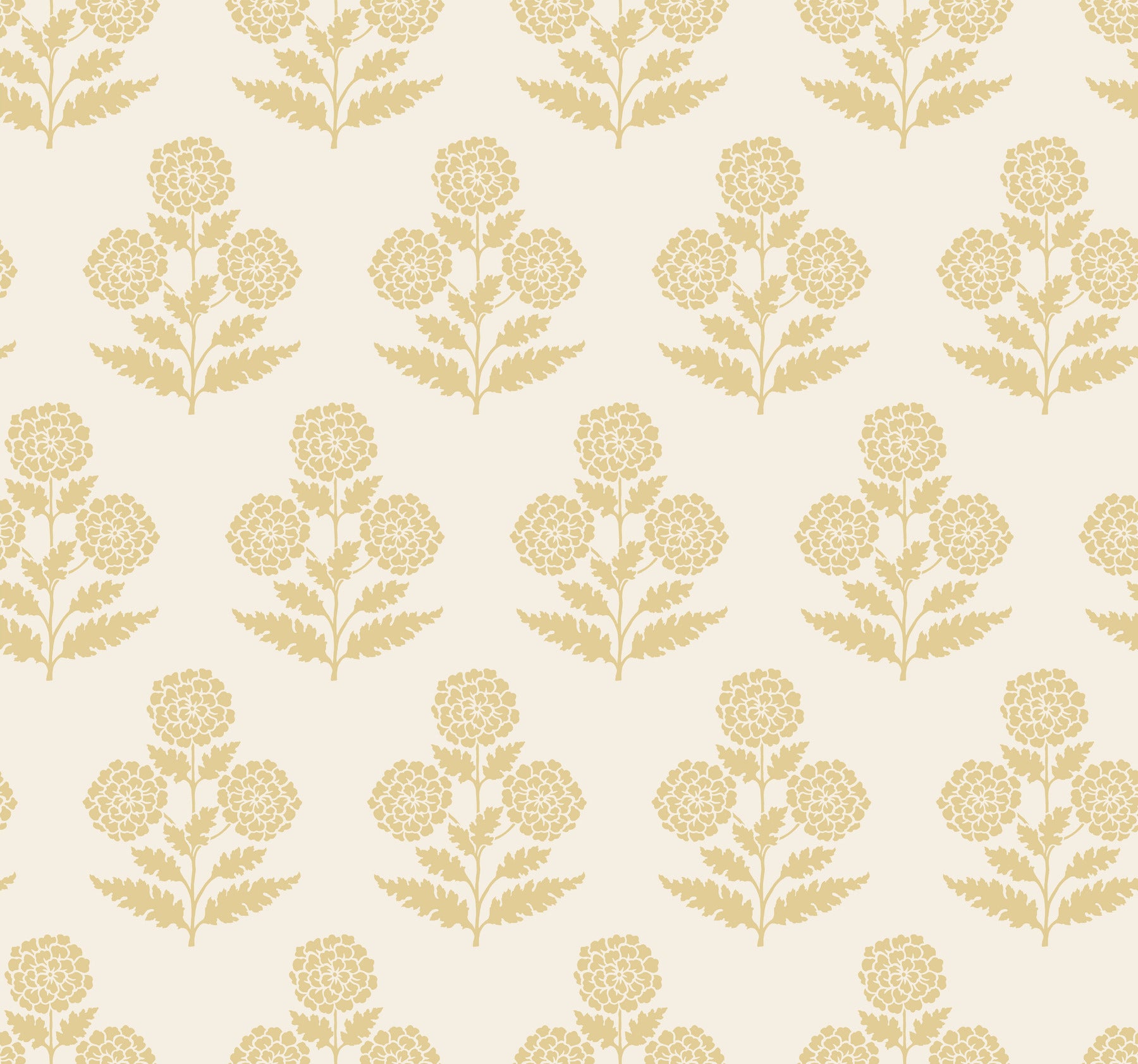 Use:A trio of voluminous marigold blooms share a singular leafy stem, the design's block print stylings bringing timeless appeal to pattern Souci. Seen here in butter yellow against cream. Souci is an unpasted, non woven wallpaper measuring 27 inches wide by 27 feet long, covering approximately 60.8 square feet per roll. Unpasted non woven material; 25.3-in repeat, straight match; Washable and strippable; 27-in by 27-ft long roll; Covers about 60.8 square feet