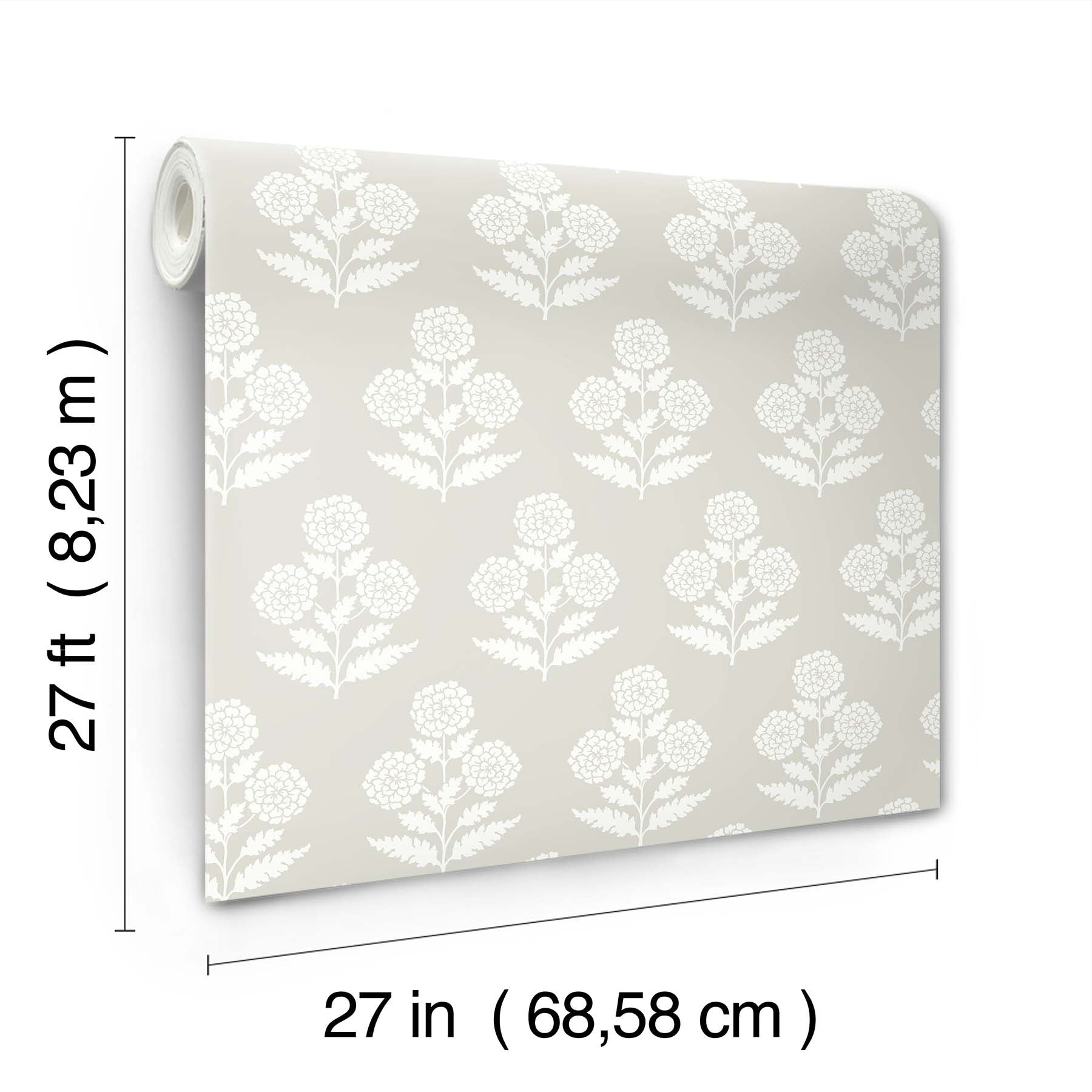 Use:A trio of voluminous marigold blooms share a singular leafy stem, the design's block print stylings bringing timeless appeal to pattern Souci. Seen here in white against warm beige. Souci is an unpasted, non woven wallpaper measuring 27 inches wide by 27 feet long, covering approximately 60.8 square feet per roll. Unpasted non woven material; 25.3-in repeat, straight match; Washable and strippable; 27-in by 27-ft long roll; Covers about 60.8 square feet